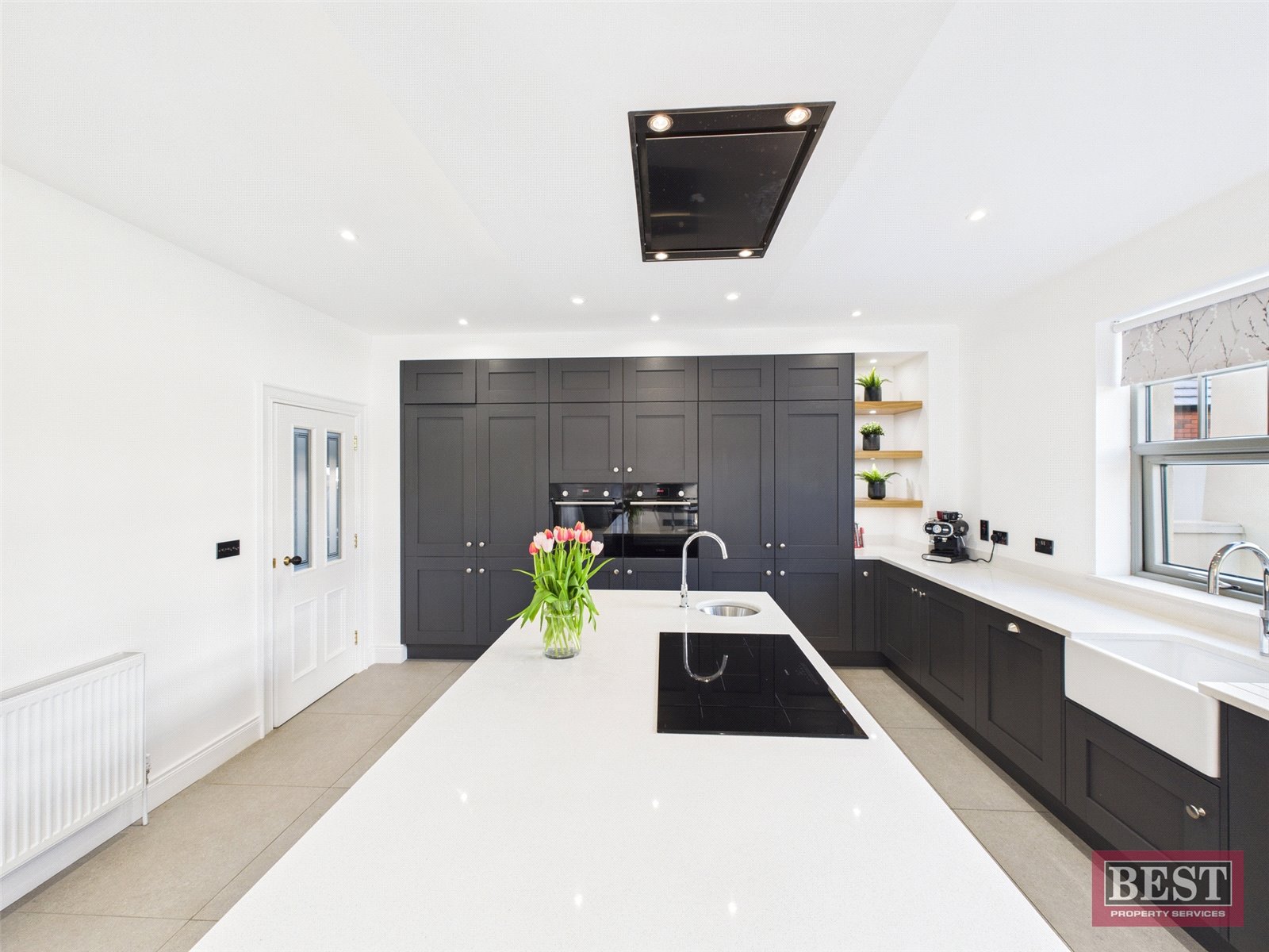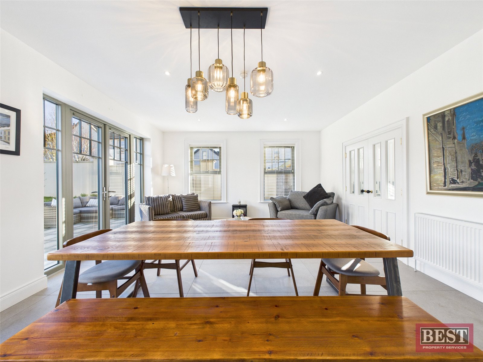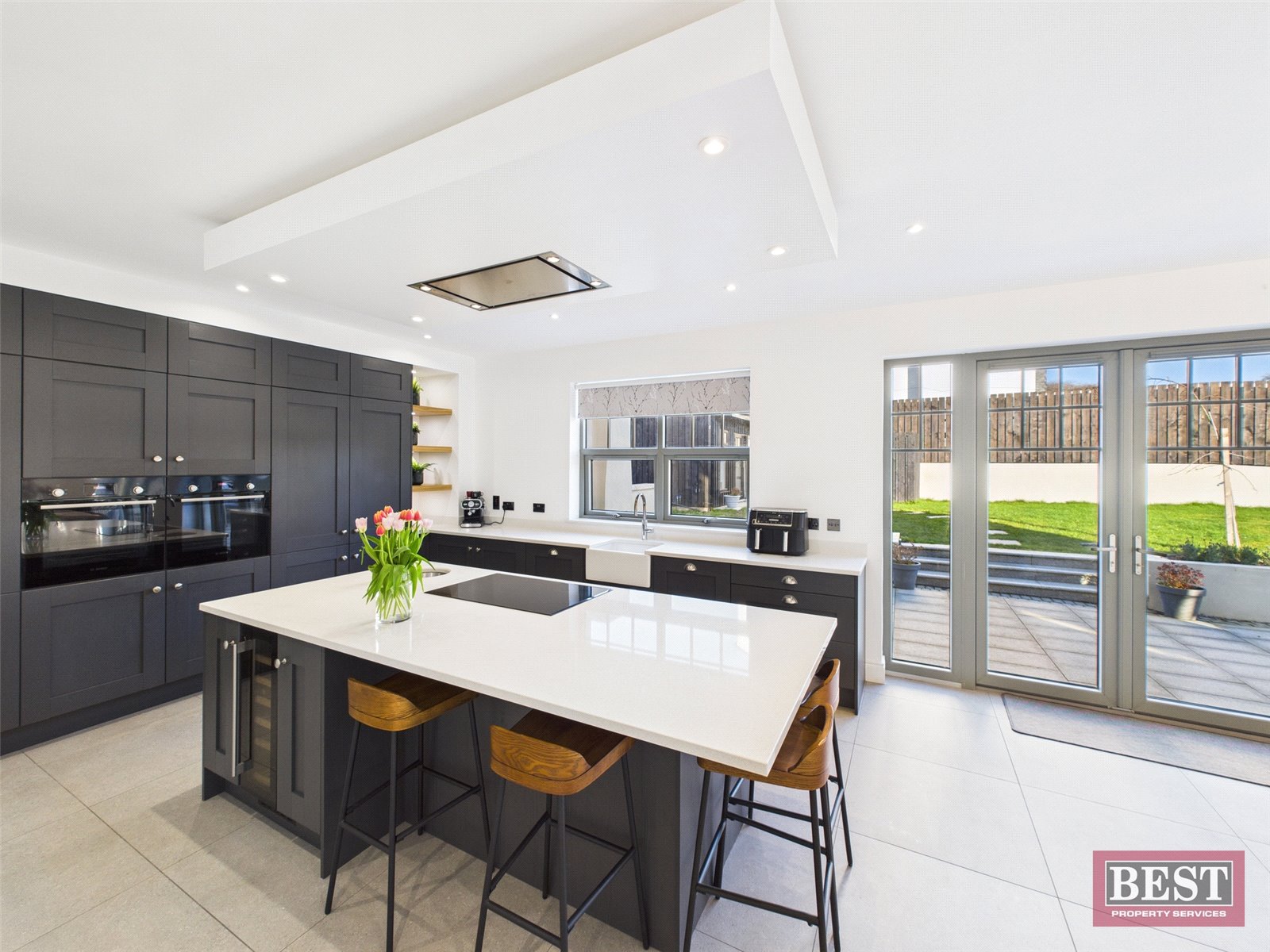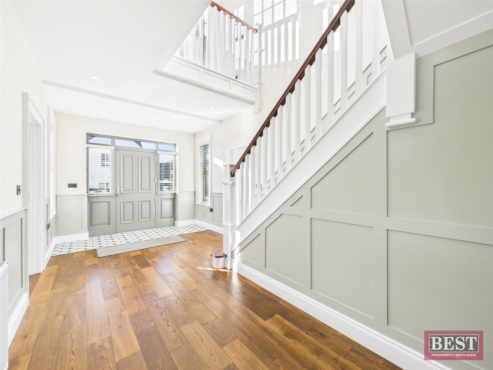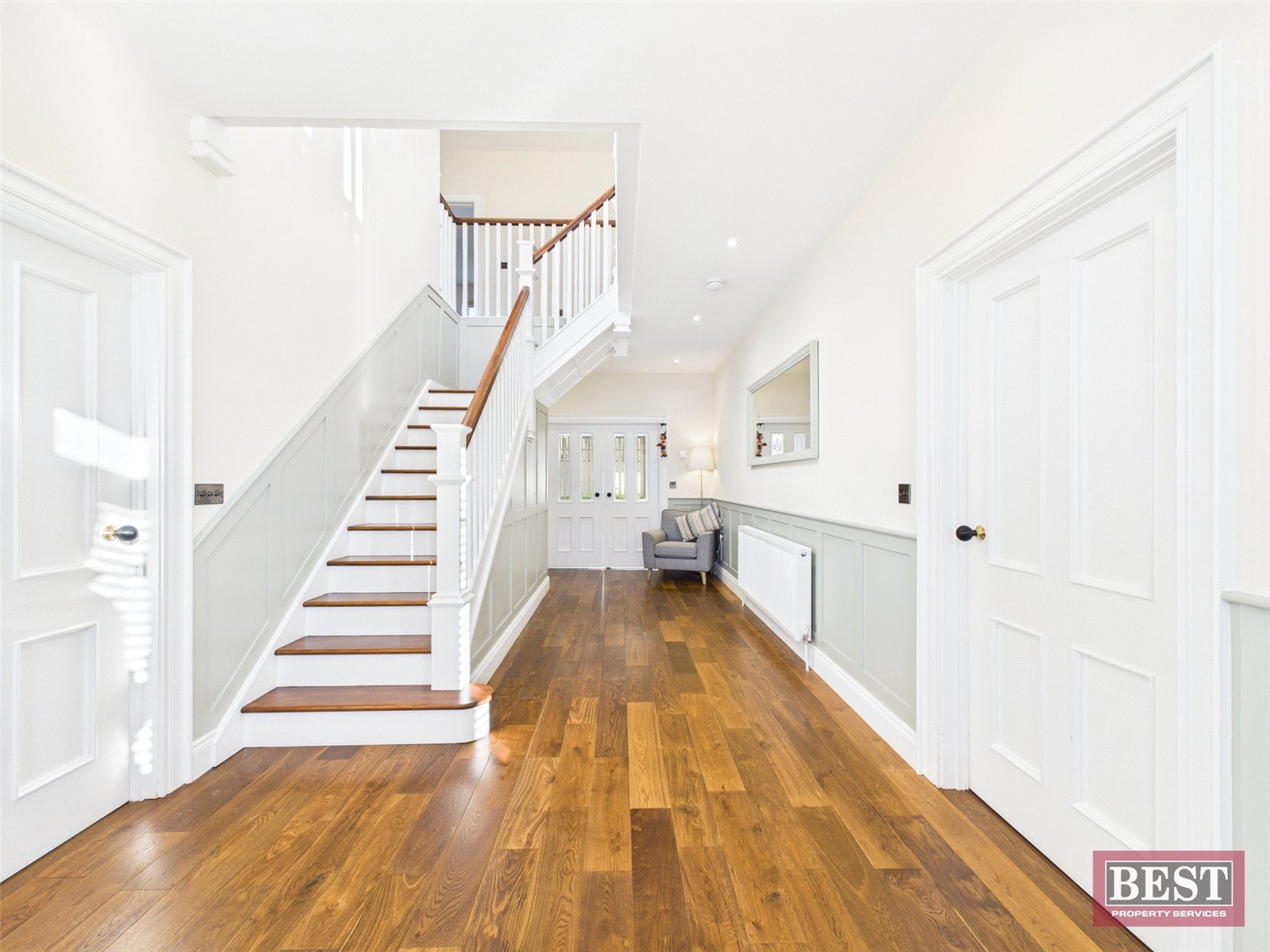 When entering the property you will be greeted by a large entrance hall with double height ceilings, engineered hard wood flooring and exquisite wall panelling giving the house a luxurious feel. There are two living rooms either side of the hallway with the larger of the two on the right hand side connecting via double doors to the kitchen/dining room. The living space on the left hand side could conveniently act as a fifth double bedroom or study if required. To the rear of the property is the heart of the home with kitchen / dining space that stretches the full width of the property. The kitchen comes complete with a full range of contemporary kitchen units, large kitchen island and access to a fully fitted utility room. The dining space has plenty of room for a family sized table and looks out onto the rear garden through two sets of double doors. Additionally, for convenience, there is under stair storage and a downstairs w/c