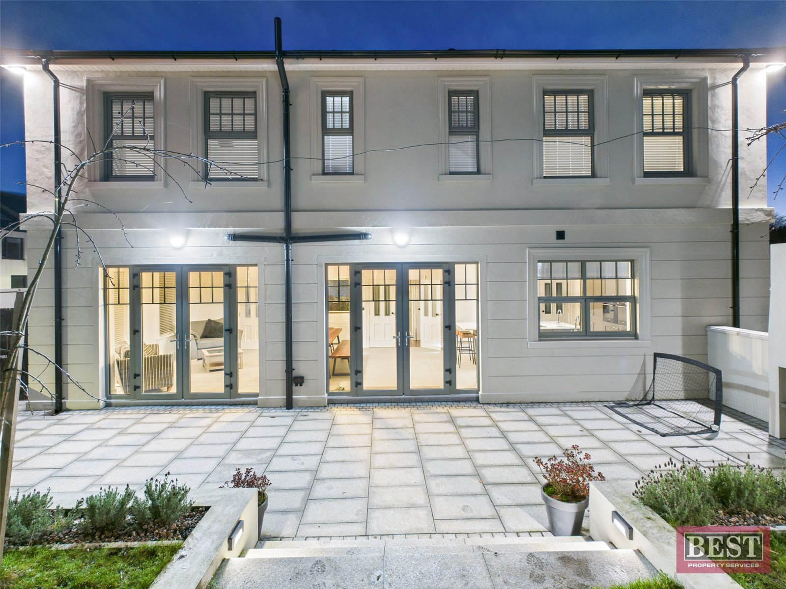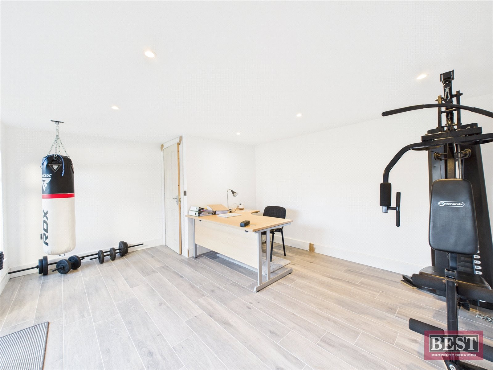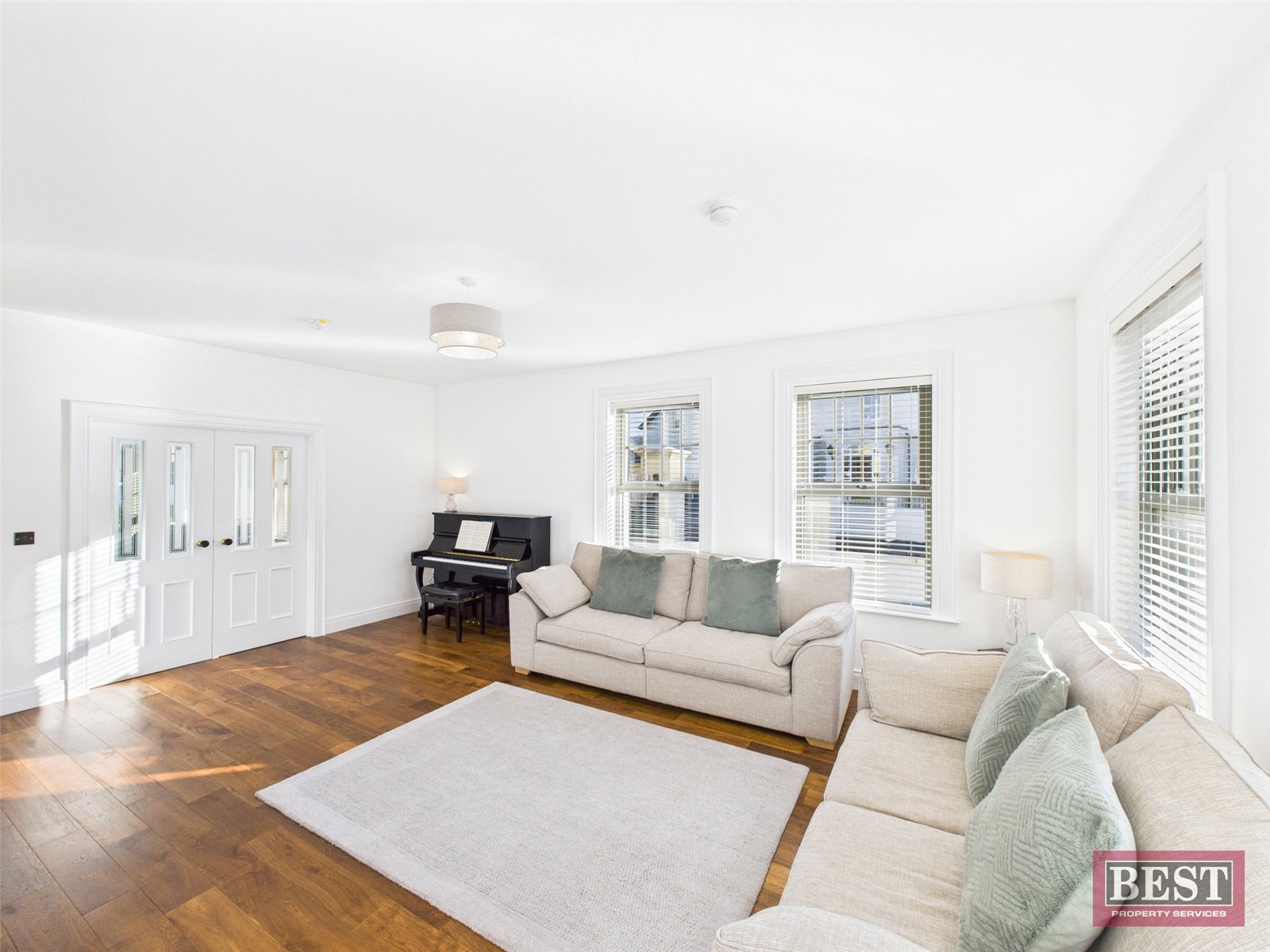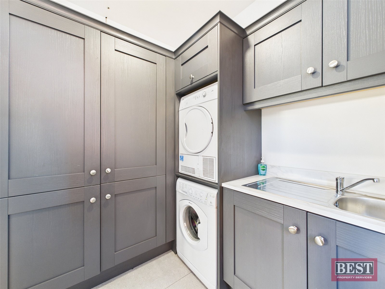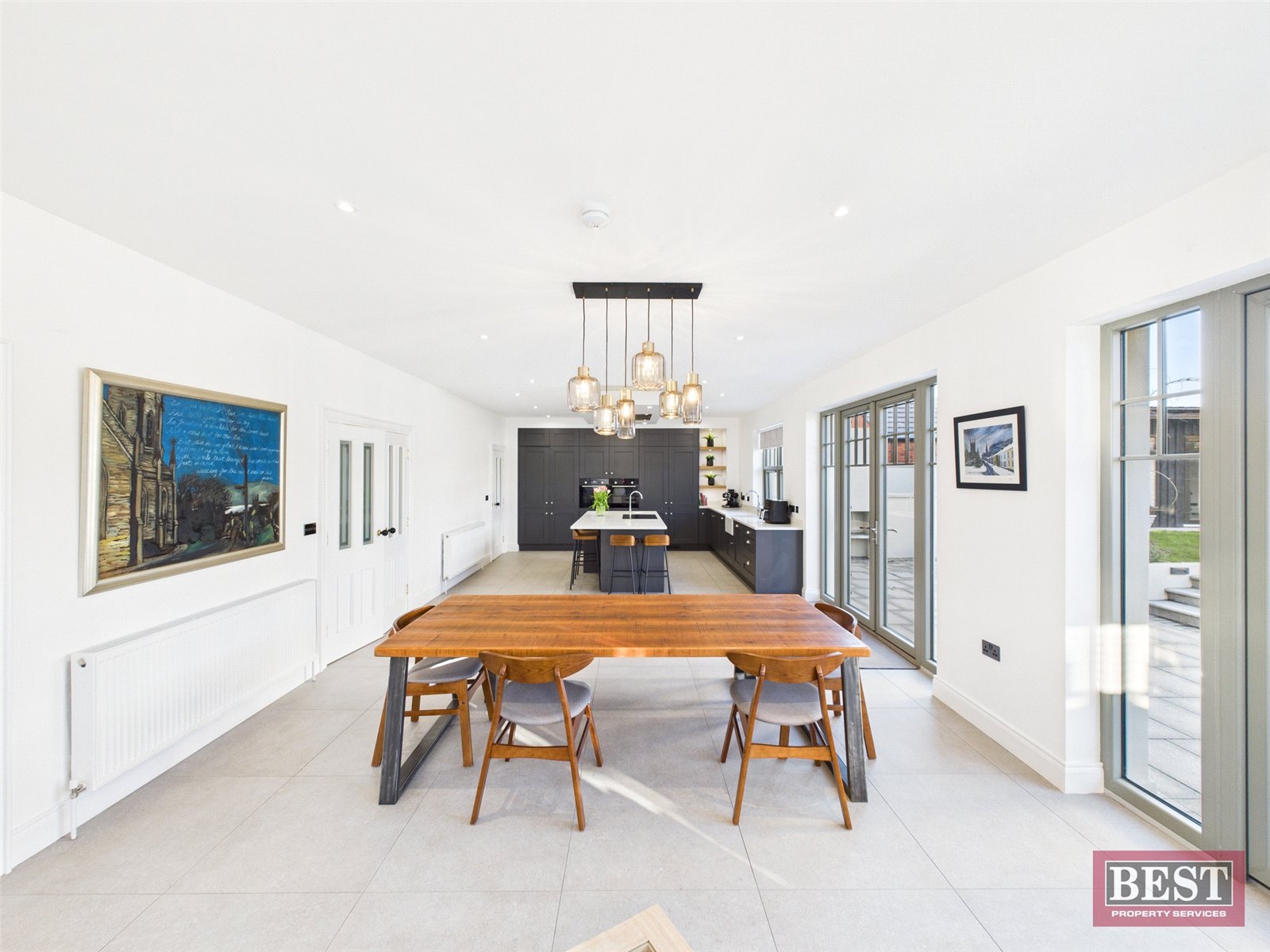 When entering the property you will be greeted by a large entrance hall with double height ceilings, engineered hard wood flooring and exquisite wall panelling giving the house a luxurious feel. There are two living rooms either side of the hallway with the larger of the two on the right hand side connecting via double doors to the kitchen/dining room. The living space on the left hand side could conveniently act as a fifth double bedroom or study if required. To the rear of the property is the heart of the home with kitchen / dining space that stretches the full width of the property. The kitchen comes complete with a full range of contemporary kitchen units, large kitchen island and access to a fully fitted utility room. The dining space has plenty of room for a family sized table and looks out onto the rear garden through two sets of double doors. Additionally, for convenience, there is under stair storage and a downstairs w/c