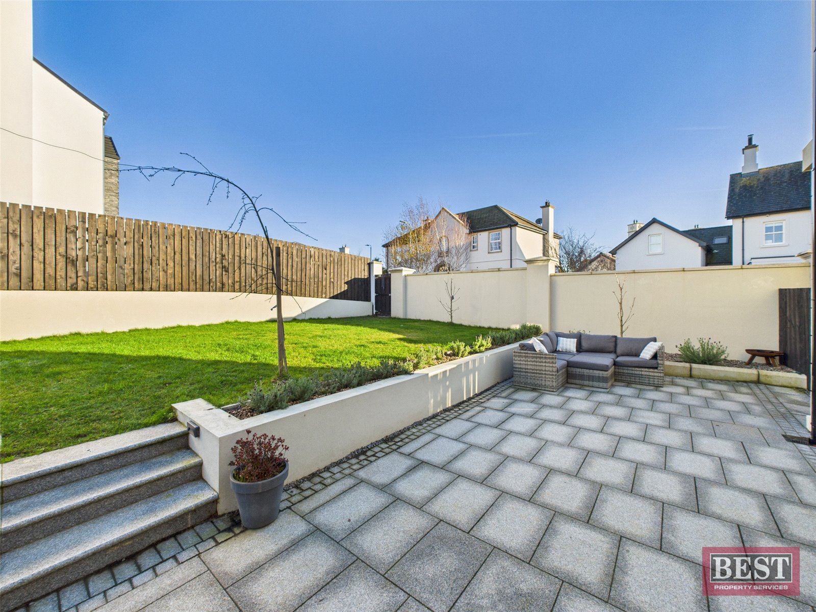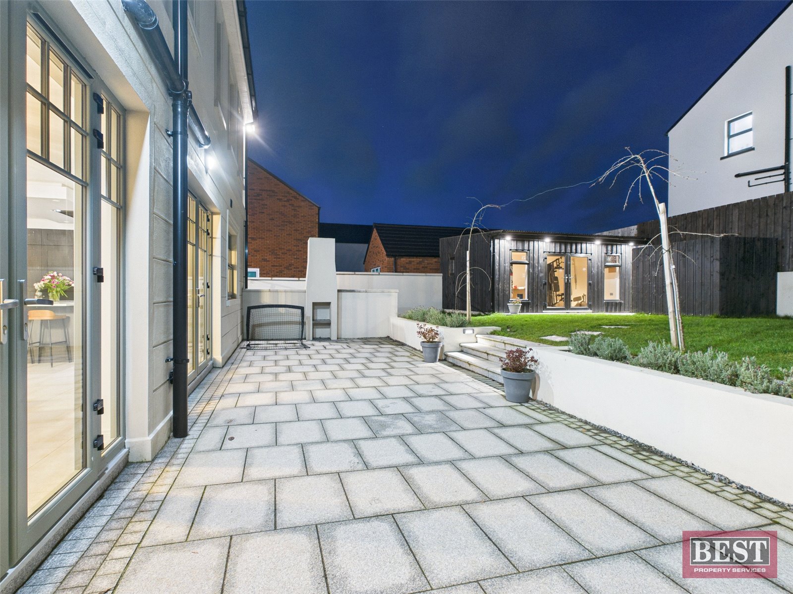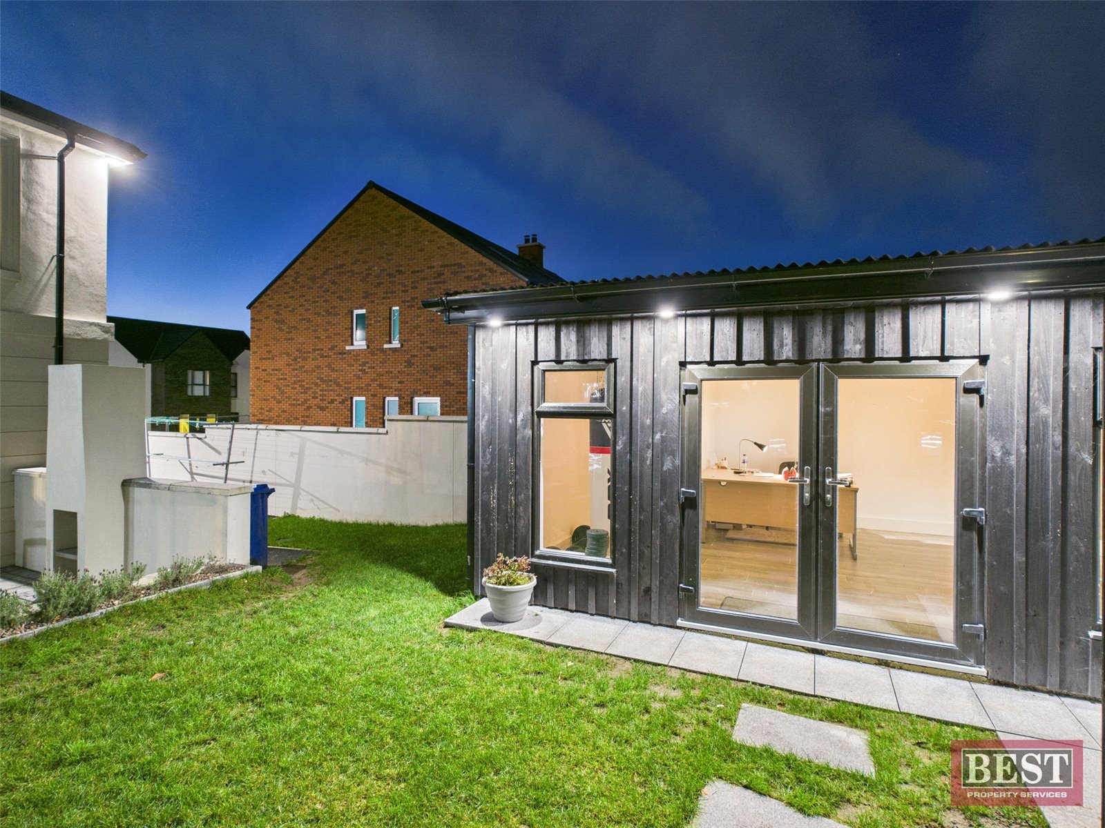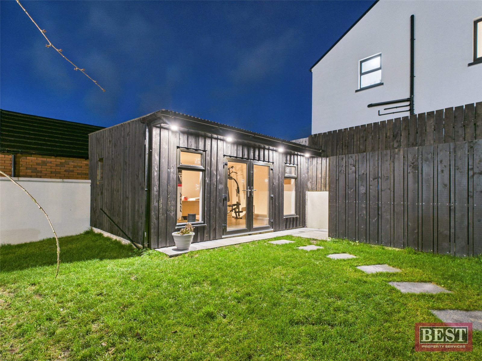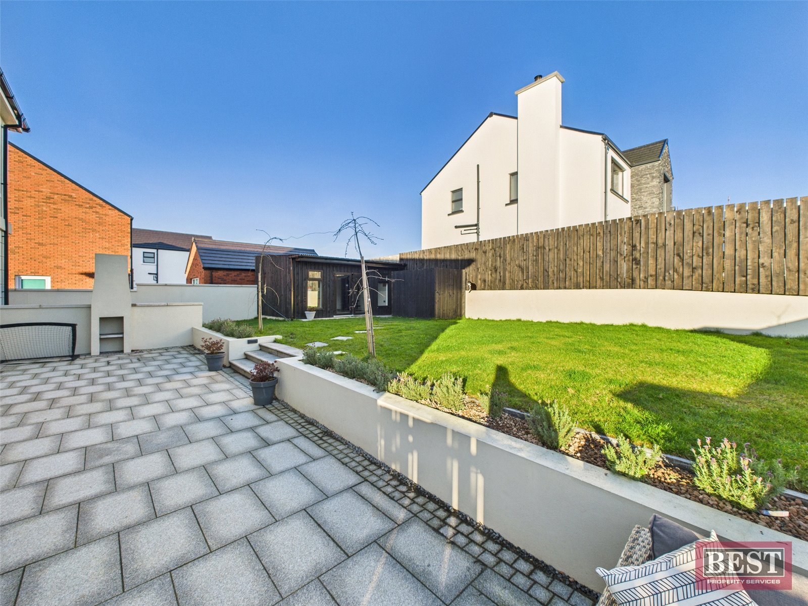 The outside of the property is just as well thought out as the inside with a rear patio just off the kitchen ideal for outdoor dining and socialising, a stepped up lawn and garden room with w/c currently being used as a home gym. To the front of the house there is a pillar block entrance, tarmac driveway and secure side access.