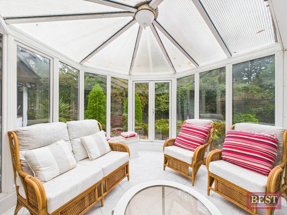 The main level also features a sizeable kitchen, with a striking red AGA that instantly becomes the focal point of the space. From here, the layout flows into a cosy living area and then into a bright sunroom overlooking the garden. A utility room, covered porch area with back door access, and an additional WC complete this floor.