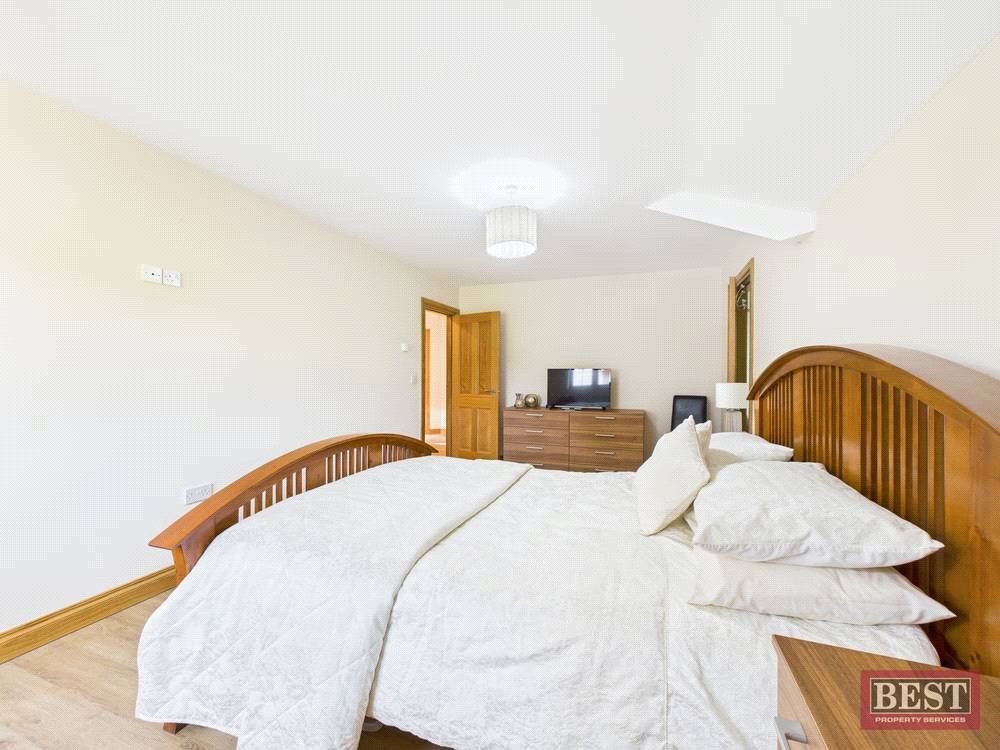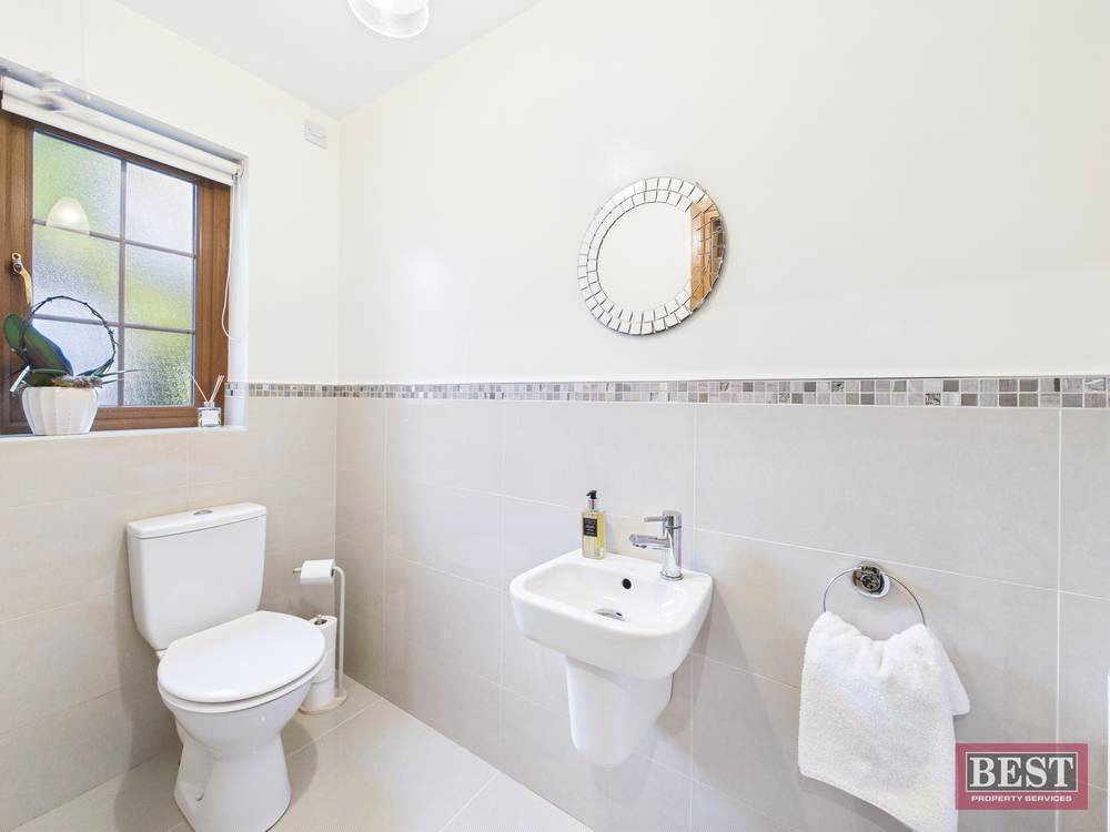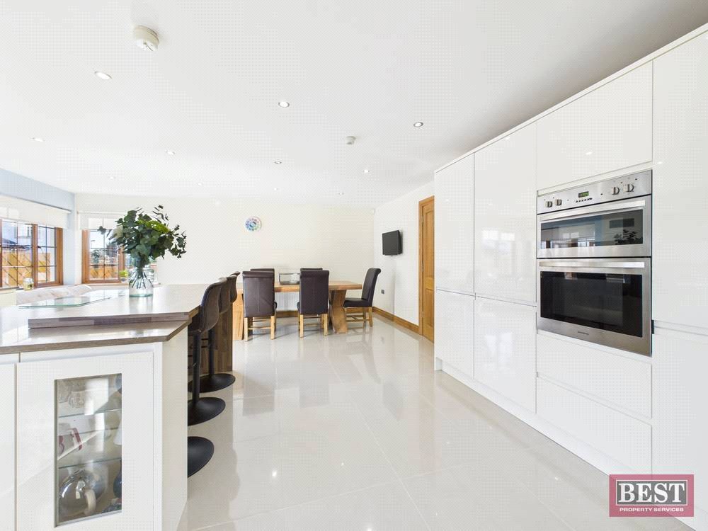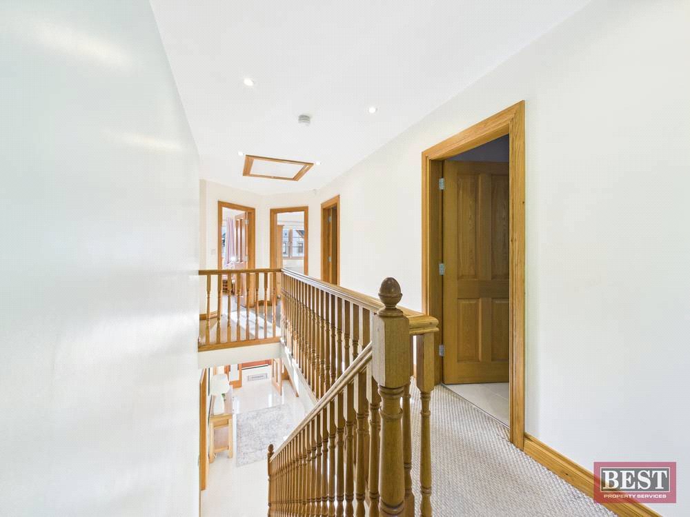 Upstairs, the property comprises three well-proportioned double bedrooms, a luxurious family bathroom, and an impressive master suite featuring a large ensuite bathroom and a spacious walk-in wardrobe that could be repurposed as a fifth bedroom if required.