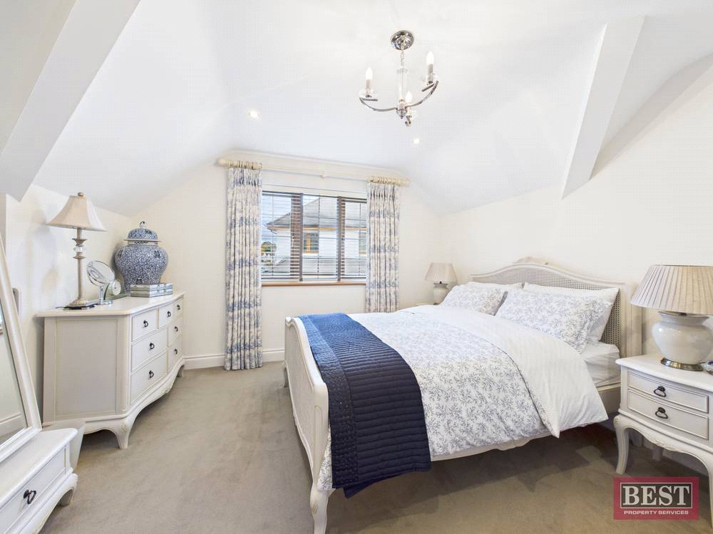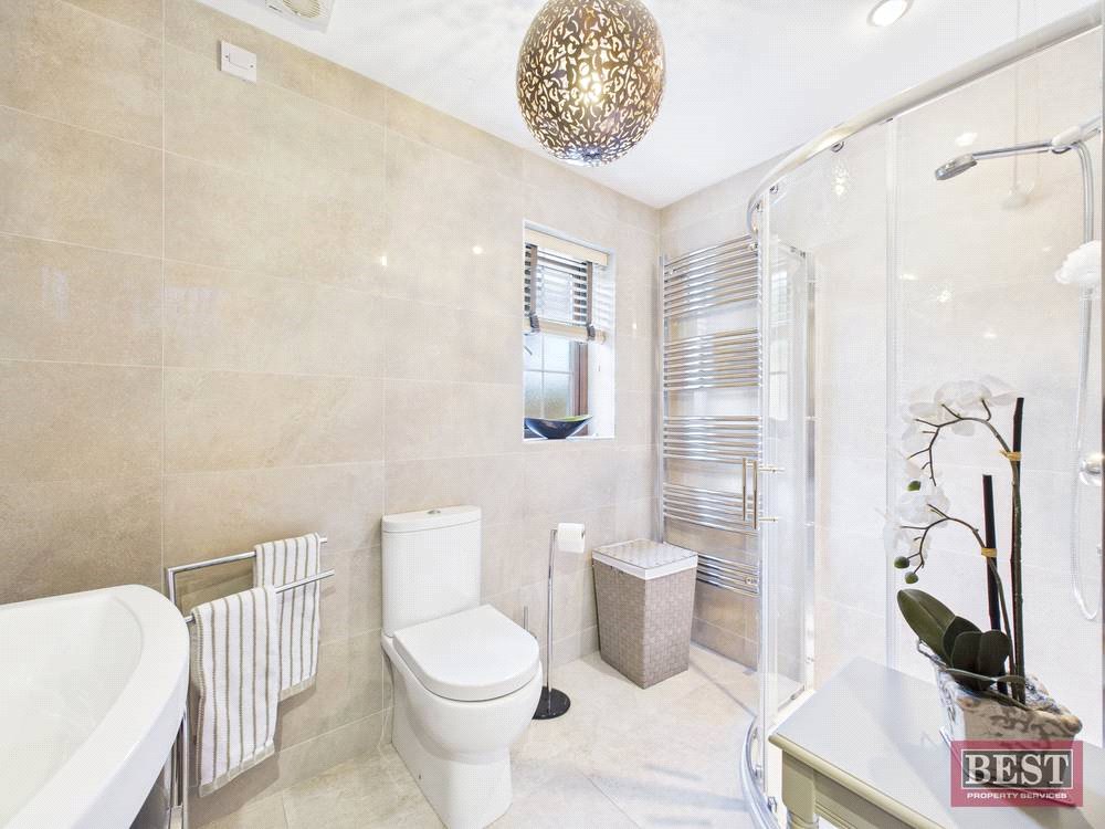 Upstairs, the property boasts a luxurious family bathroom with his-and-hers sinks, two double bedrooms with fitted wardrobes, and an impressive master suite featuring a large ensuite bathroom.