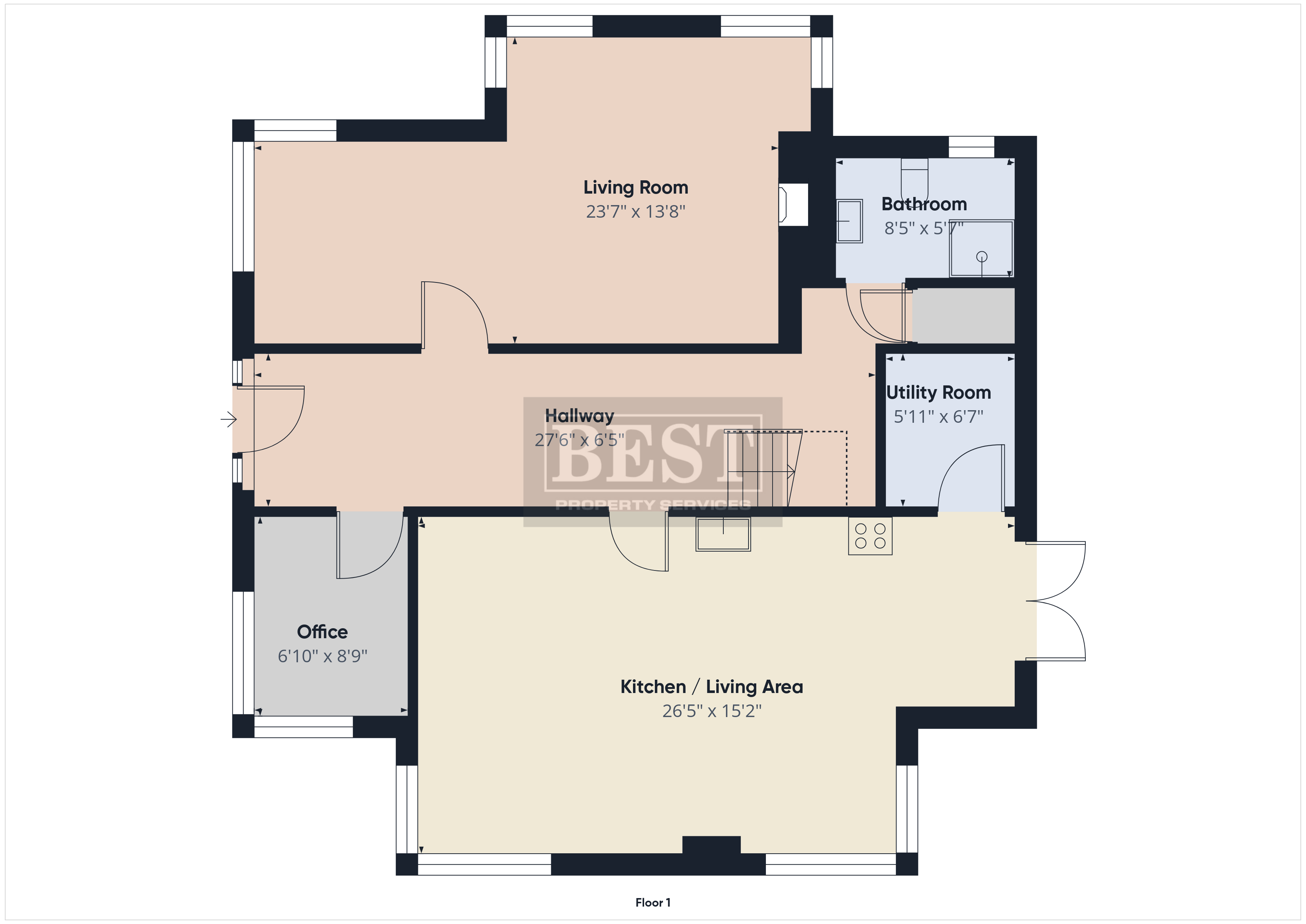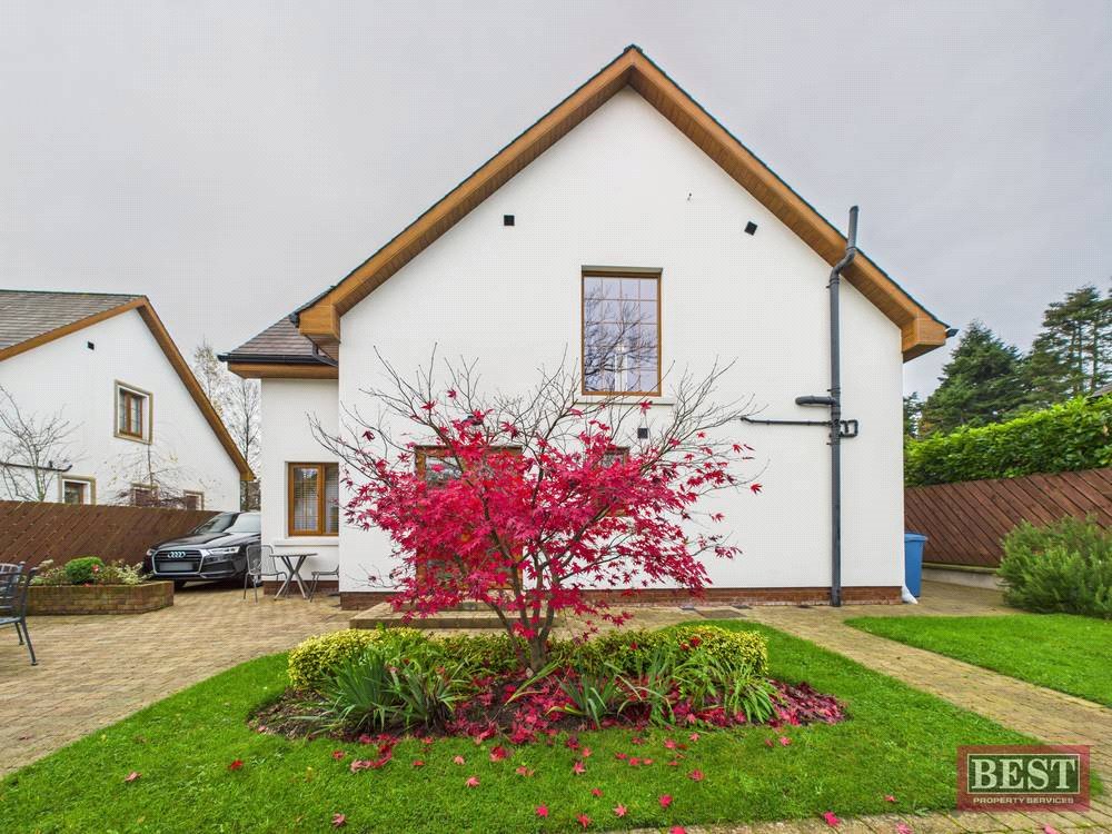 As you enter the spacious hallway, you´ll find a bright office to the right and a generous living room with a multi-fuel stove to the left. The modern kitchen comes fully equipped with all the contemporary features you´d expect, complemented by a large open-plan sitting area and double doors leading to the rear garden. A separate utility room adds practicality, while a downstairs bathroom with shower completes the ground floor.