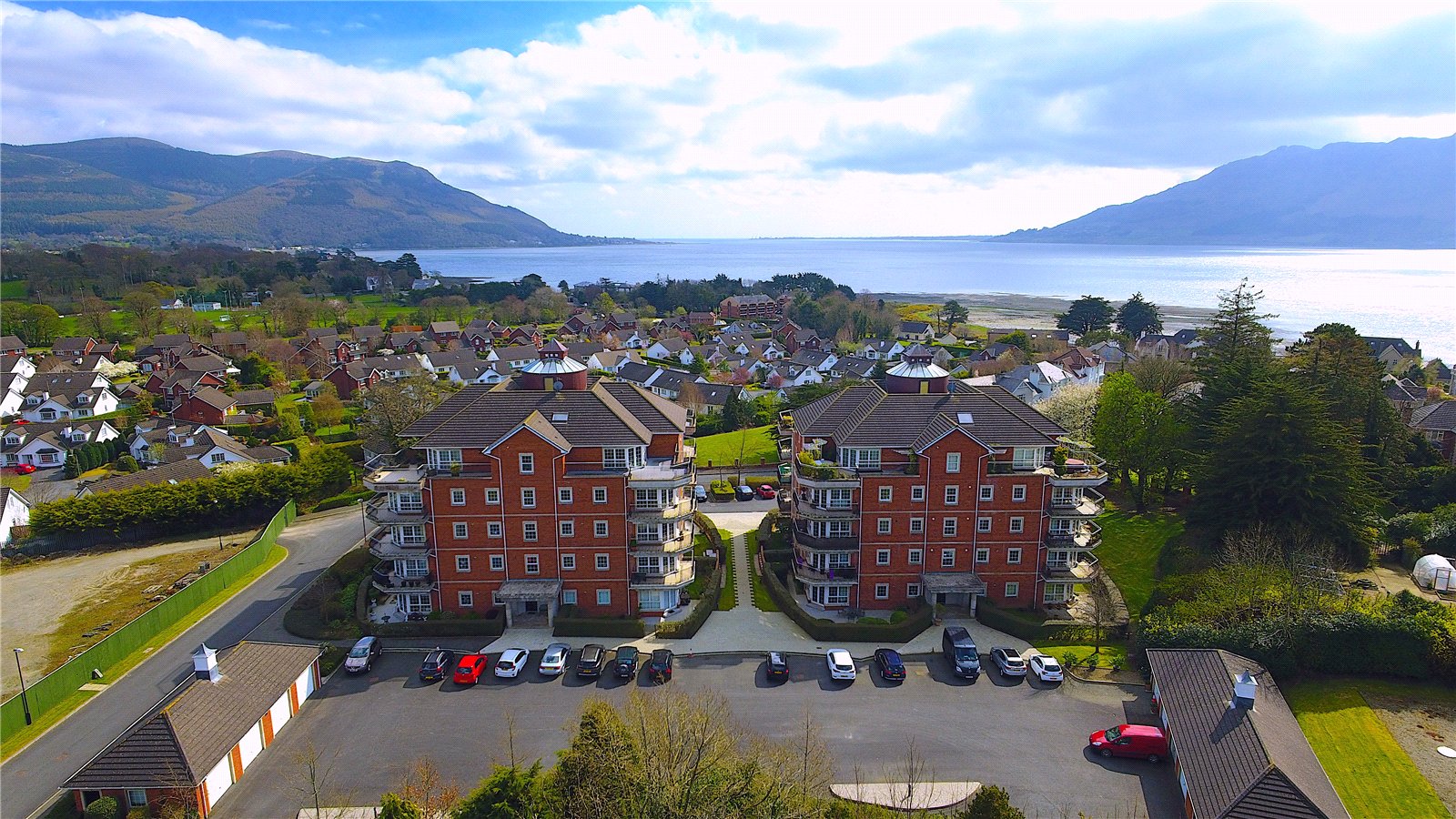 Set in an area of outstanding natural beauty, the property enjoys a prime position within walking distance of the beach and the vibrant Warrenpoint Town Centre, with its array of shops, cafés, and local amenities with the added benefit of balcony views across Carlingford Lough and the majestic Mourne Mountains. Finished to an excellent standard throughout, the apartment boasts a spacious and welcoming entrance hall with stylish tiled flooring. The bright and contemporary open-plan kitchen, dining, and living area features elegant wooden flooring and French doors leading out to a private balcony perfect for enjoying the stunning coastal scenery. The property comprises two generously sized double bedrooms, including a superb principal bedroom with a modern fully tiled ensuite shower room with underfloor heating. A well-appointed main bathroom features a sleek three-piece suite with separate shower cubicle and is fully tiled. Additional conveniences include a separate utility room fitted with a range of units including a washing machine and tumble dryer. The building further benefits from lift access to all floors, providing ease of access to this third-floor apartment. This superb apartment offers a rare opportunity to enjoy luxury coastal living in one of the area´s most desirable developments. There is ample parking to the front and the rear of the building. This is an ideal purchase for those seeking luxury accommodation on one level, with privacy, security and an added benefit of beautiful views.