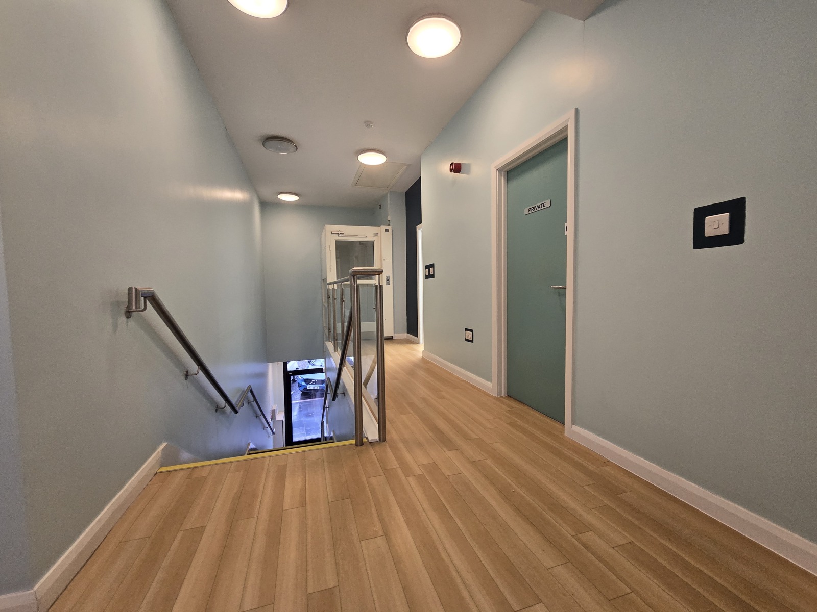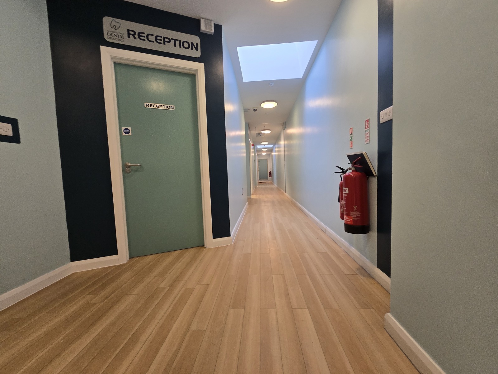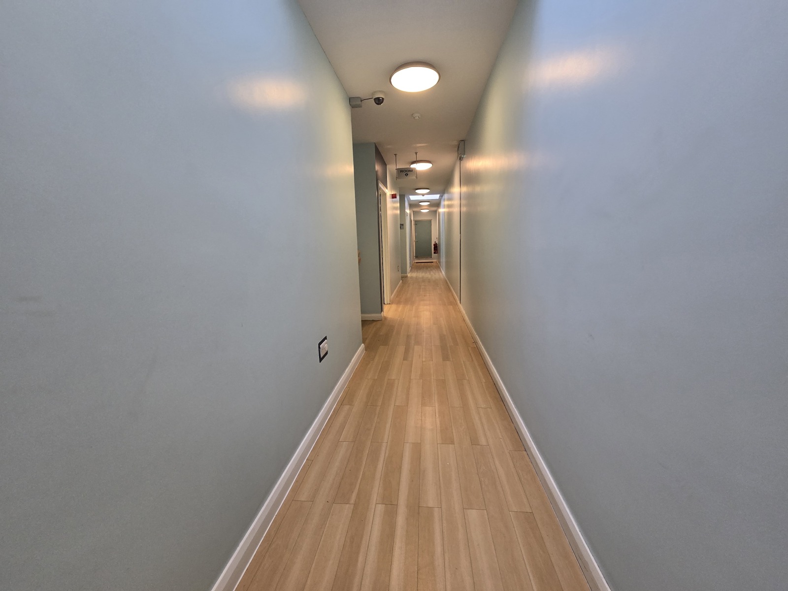Lamintate floor, fire extinguisher, CCTV.