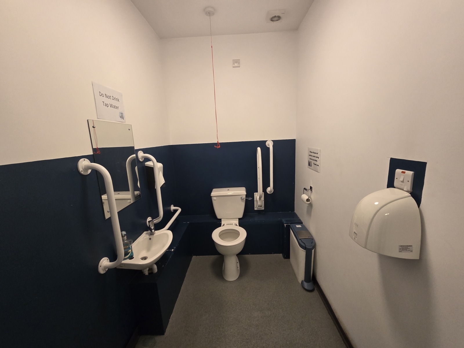 Diabled toilet, sink, Assistance Rails, emergency pull cord, hand dryer.