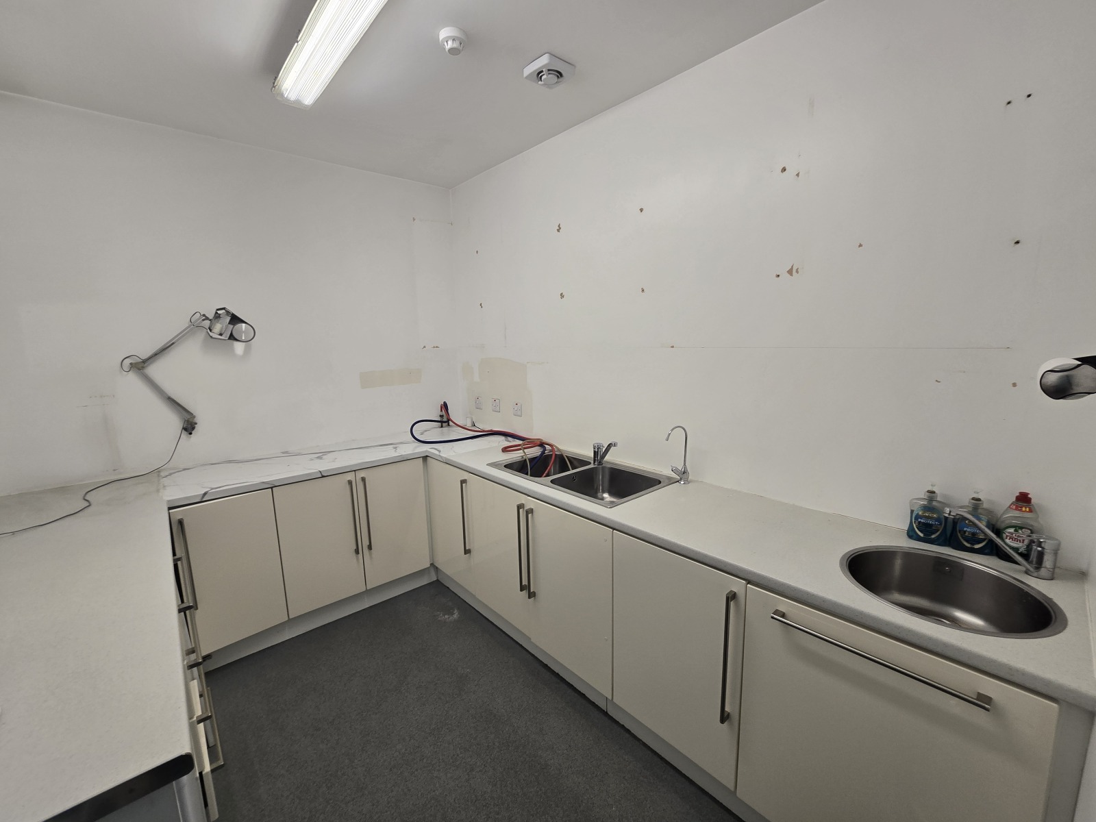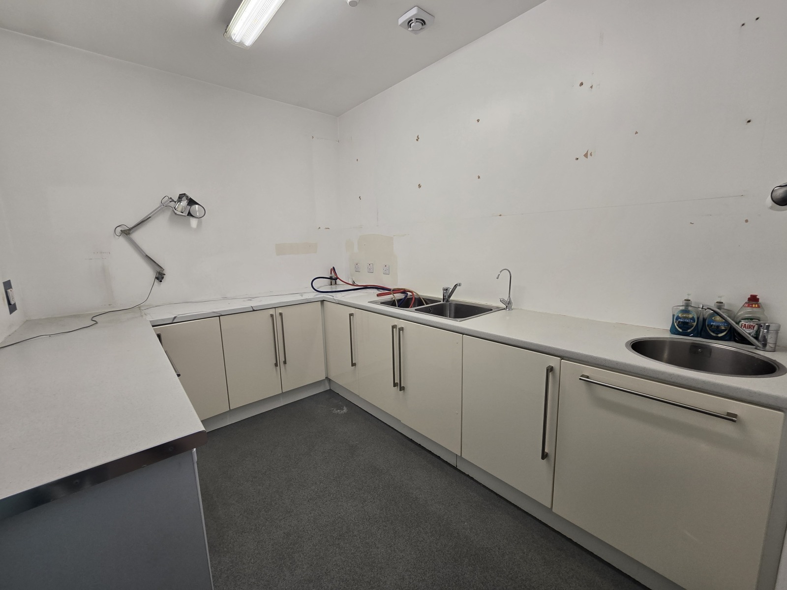 Laminte floor, low level storage units, extractor fan, stainless steel tap with mixer.