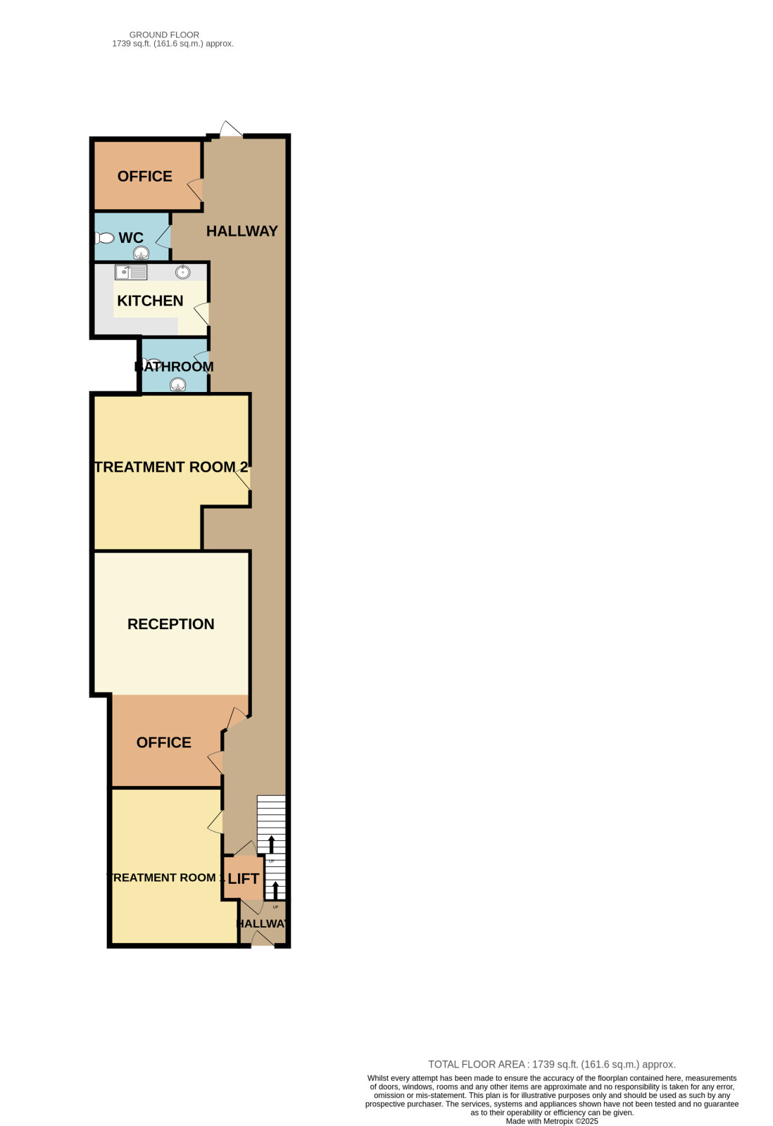 The internal layout is practical and adaptable, comprising a spacious reception area, two treatment rooms, two office spaces, a kitchen, a W.C., and an additional bathroom. A central hallway provides smooth circulation throughout the unit, while the arrangement of rooms allows for private consultation spaces or versatile office/studio use.
