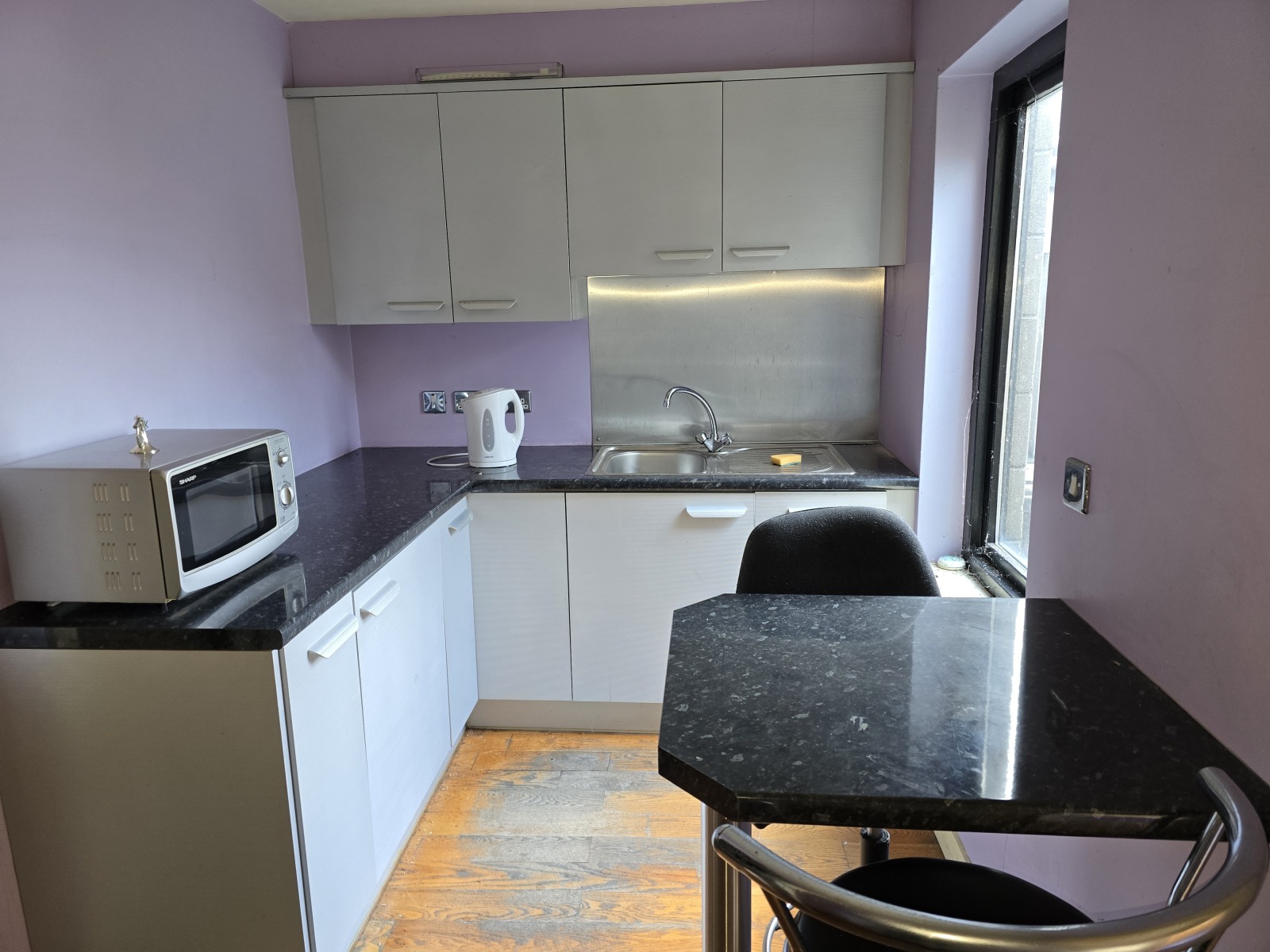 Wooden floor, high and low level storage units, sink.