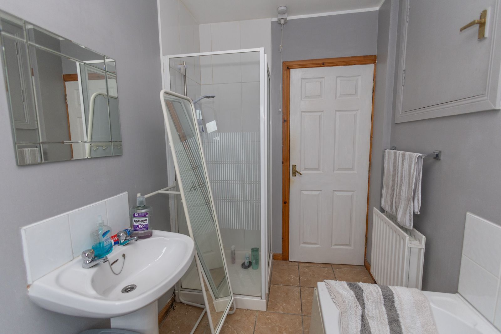 3 piece bathroom suite with walk-in electric shower, Tiled flooring and partially tiled walls.