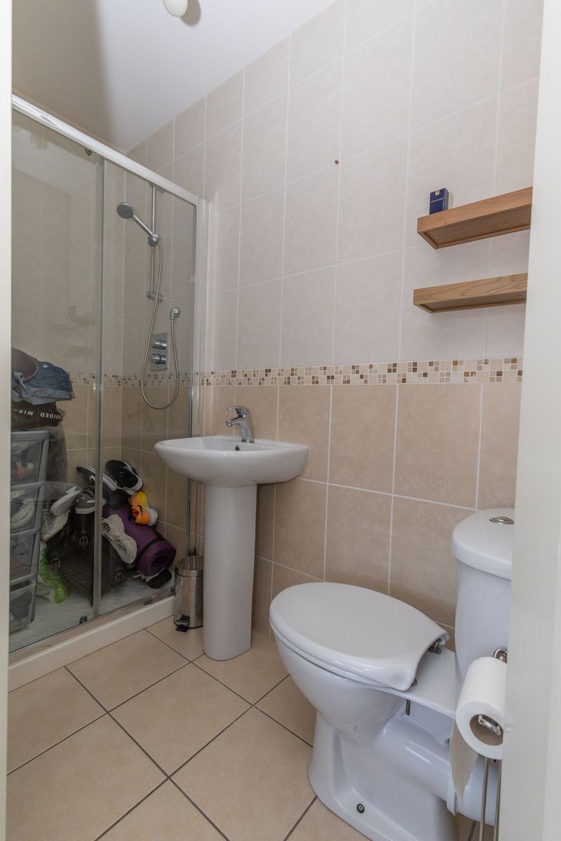 Tiled flooring. Fully tiled walls. Low flush wc. Pedestal sink. Shower unit with a thermostatic shower. Floating wall shelves.