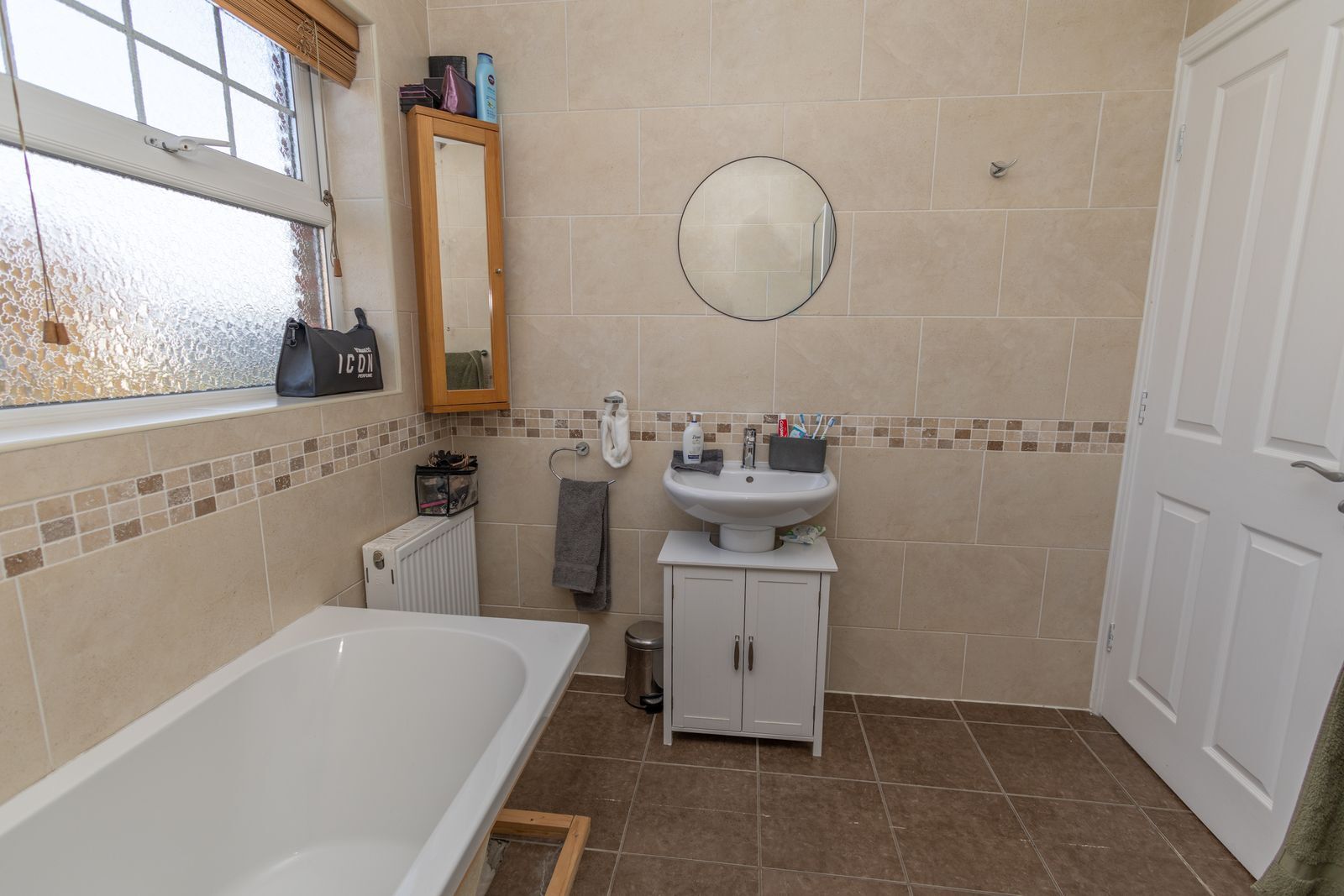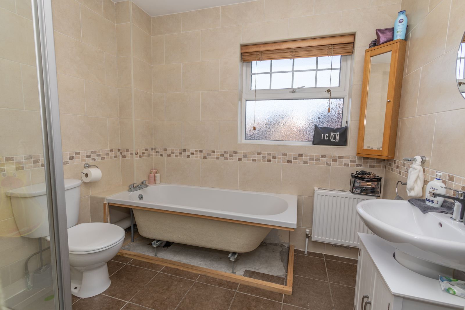Tiled flooring. Fully tiled walls. Low flush wc. Pedestal sink with hromr mono tap and storage. Bath. Shower unit with a thermostatic shower. Wall-mounted corner unit with mirror.