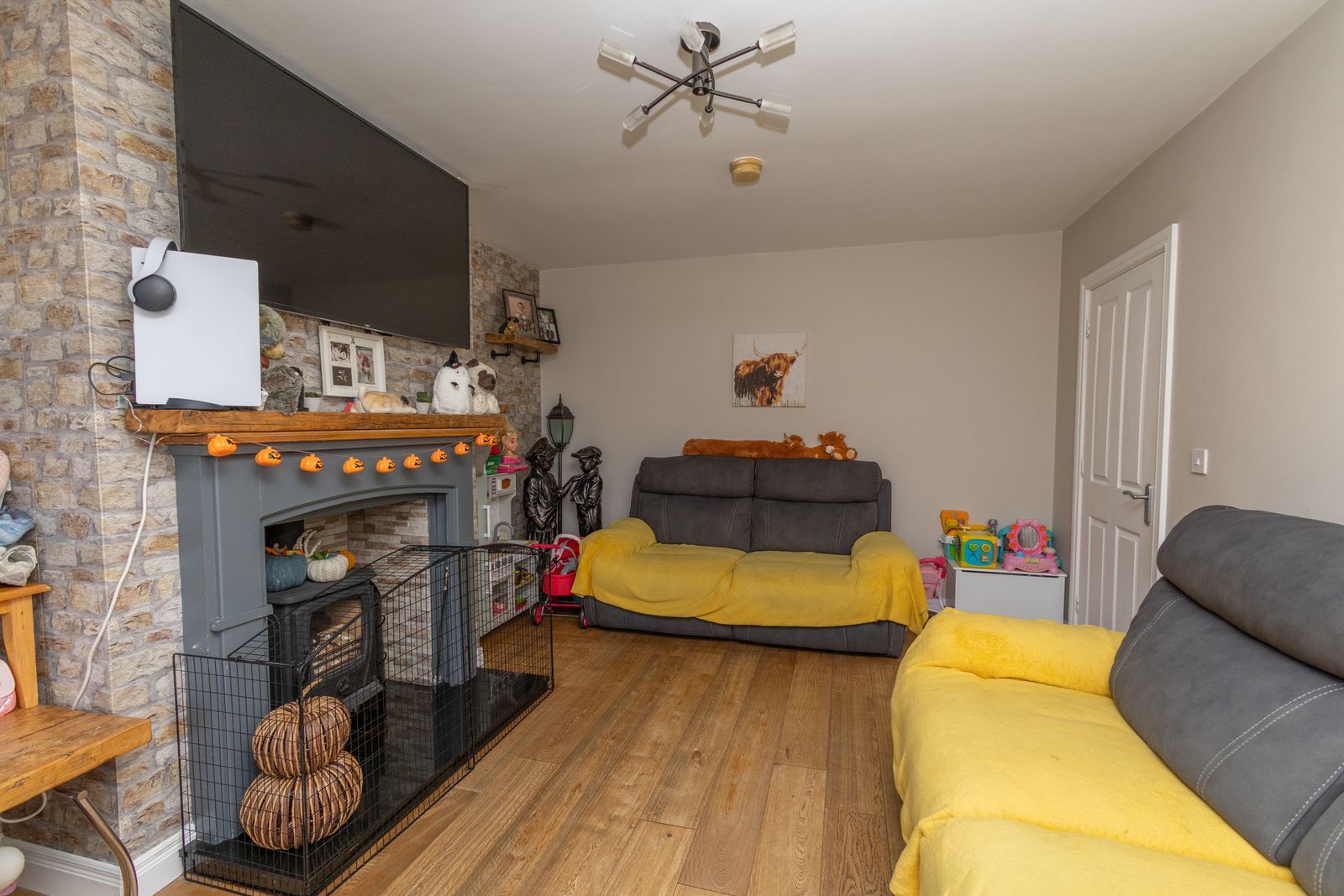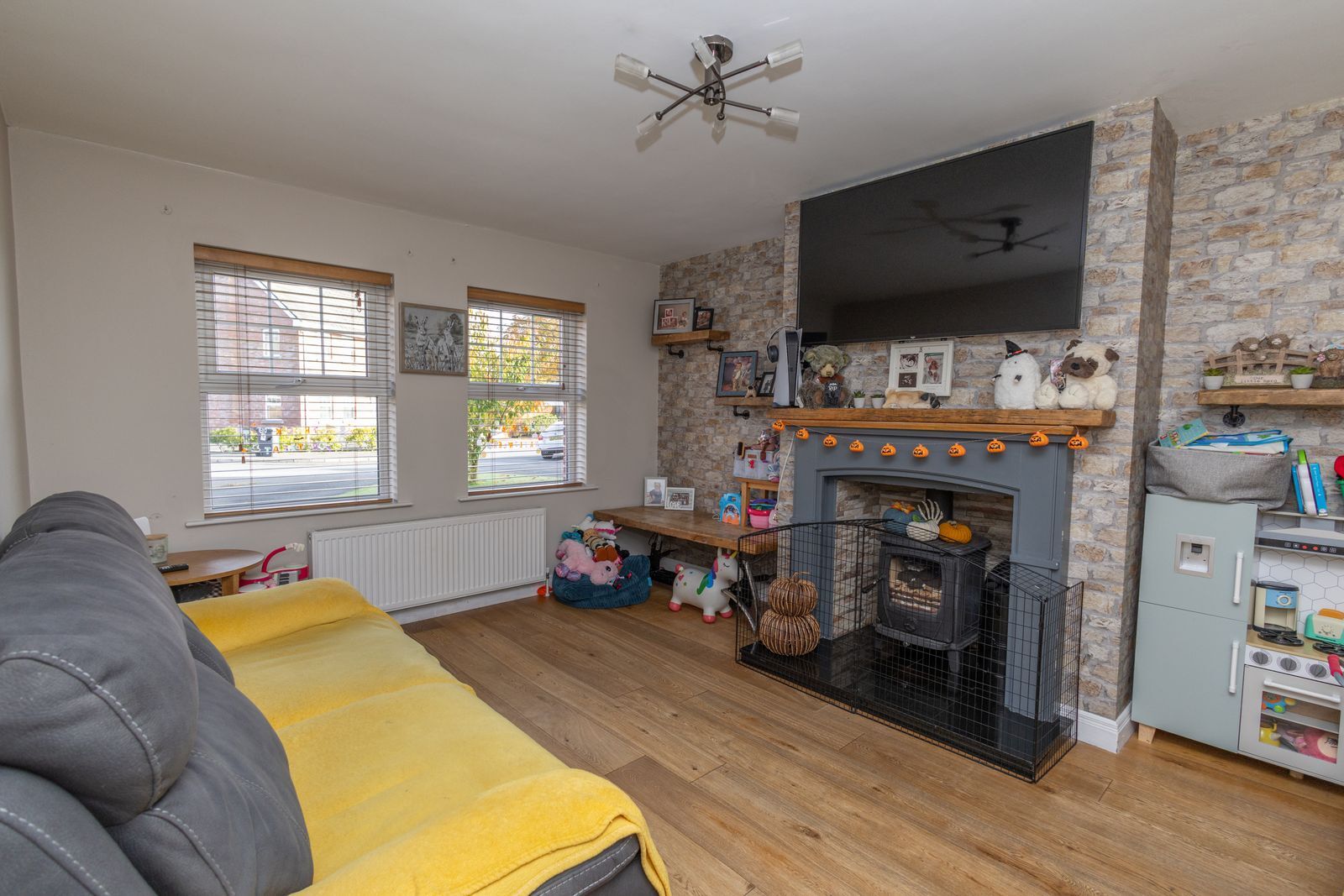 Laminate flooring. Painted fire surround with wooden mantel and tiled hearth. Multi fuel stove burner.