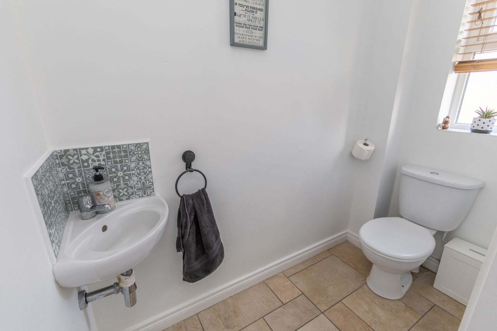 Tiled flooring. Low flush wc. Corner sink with decorative tiled splashback.