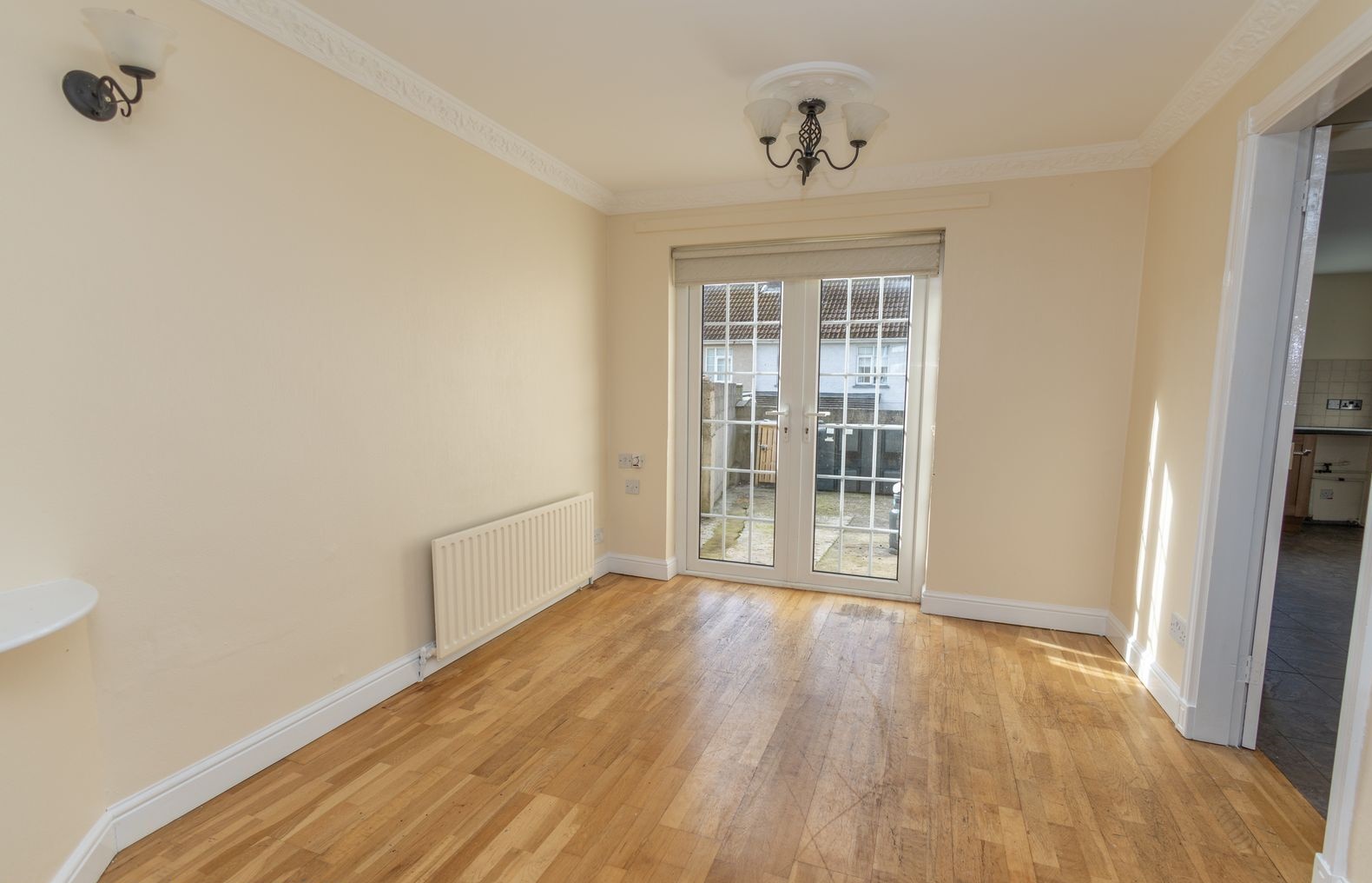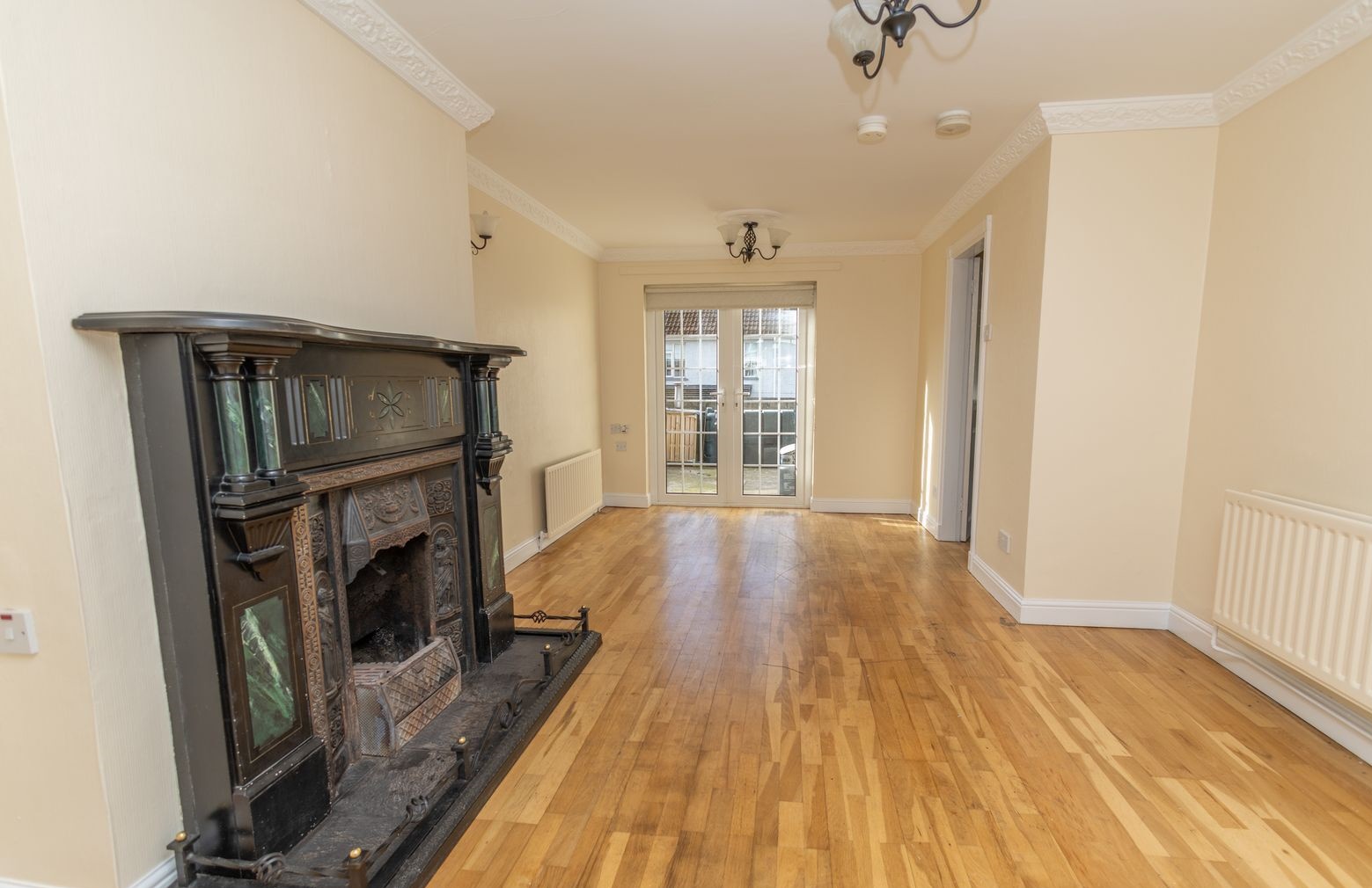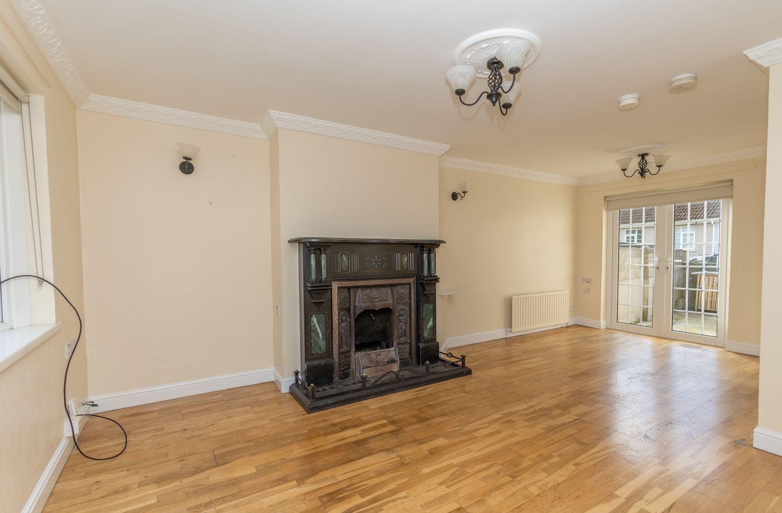 Wooden flooring. Ornate open fire with marble surround and tiled hearth. Bay window. T.V. point. Wall lights. Patio doors leading to rear garden