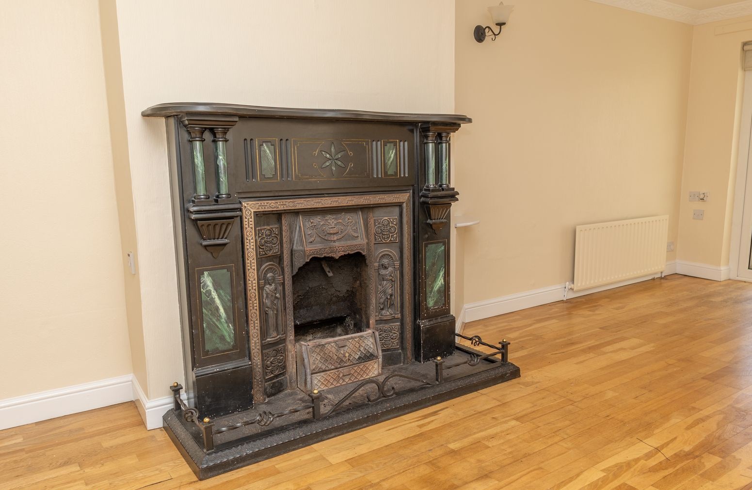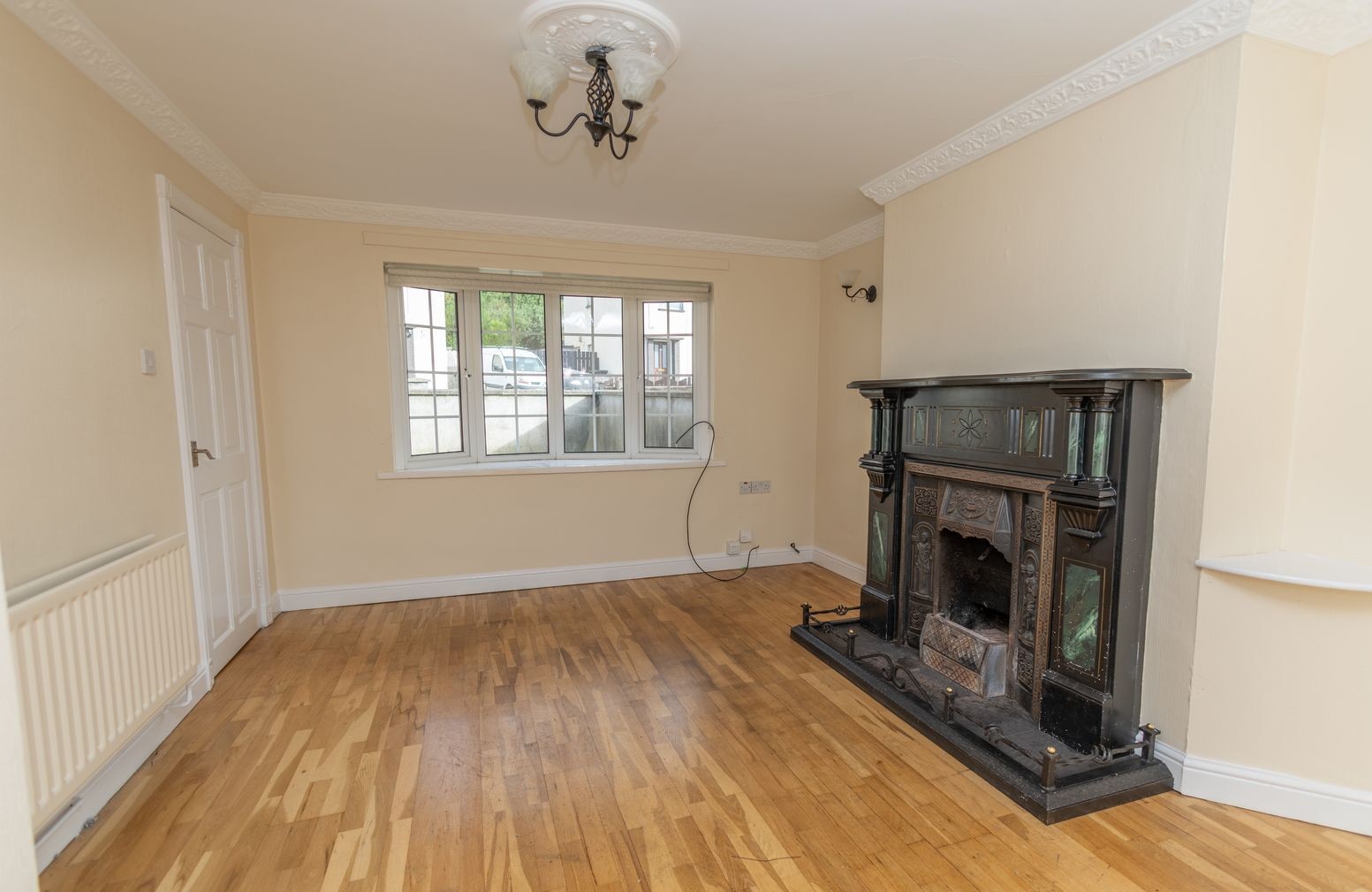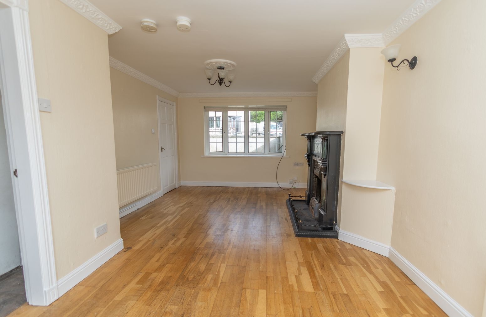 Wooden flooring. Ornate open fire with marble surround and tiled hearth. Bay window. T.V. point. Wall lights. Patio doors leading to rear garden