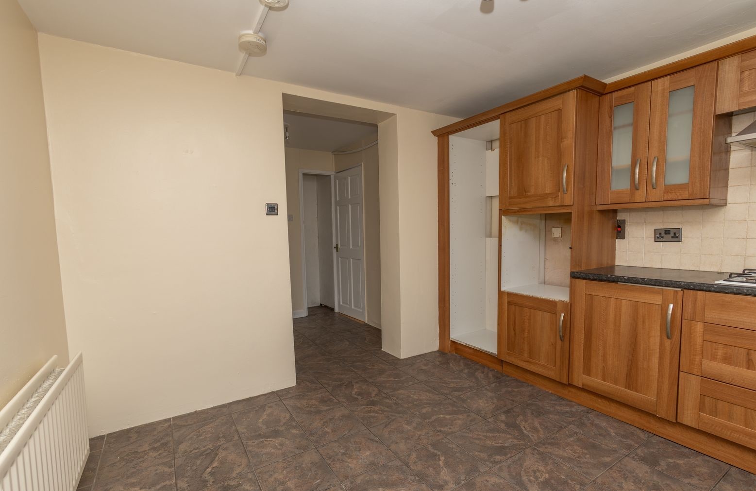 Range of high and low level units. Tiled flooring. Gas hob and extractor fan. Stainless steel sink unit with mixer taps. Plumbed for washing machine/Dish Washer