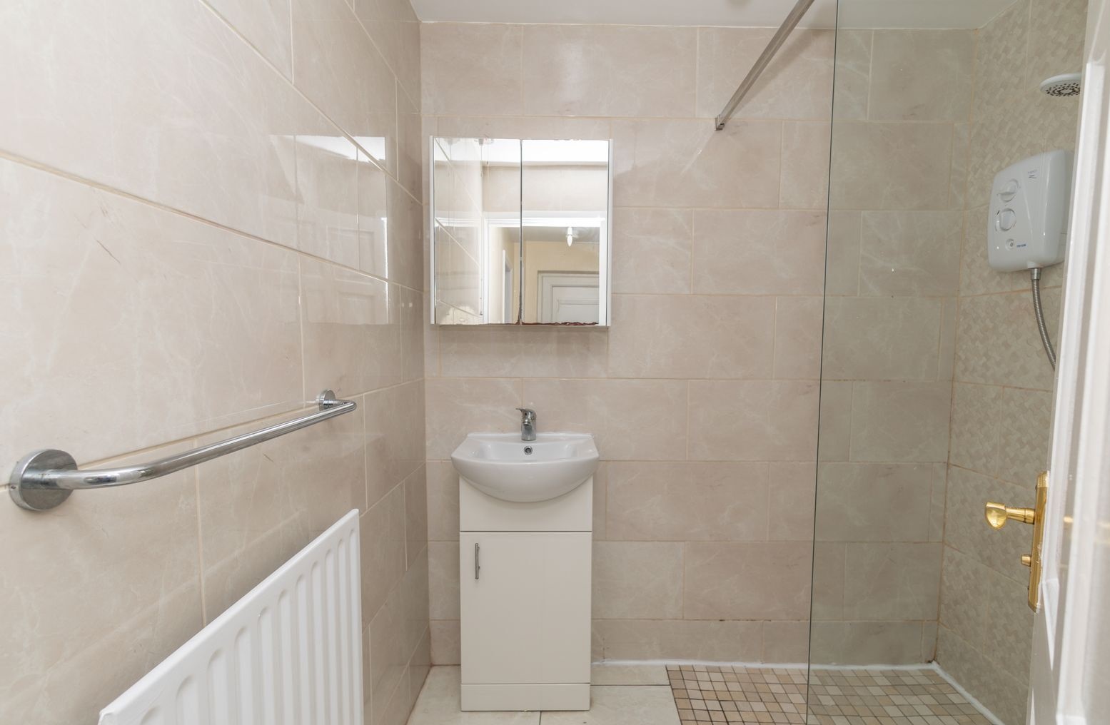 Walk in electric shower. Toilet and wash hand basin. Small storage cupboard under sink. Wall mirrored cabintt Tiled flooring and fully tiled walls.