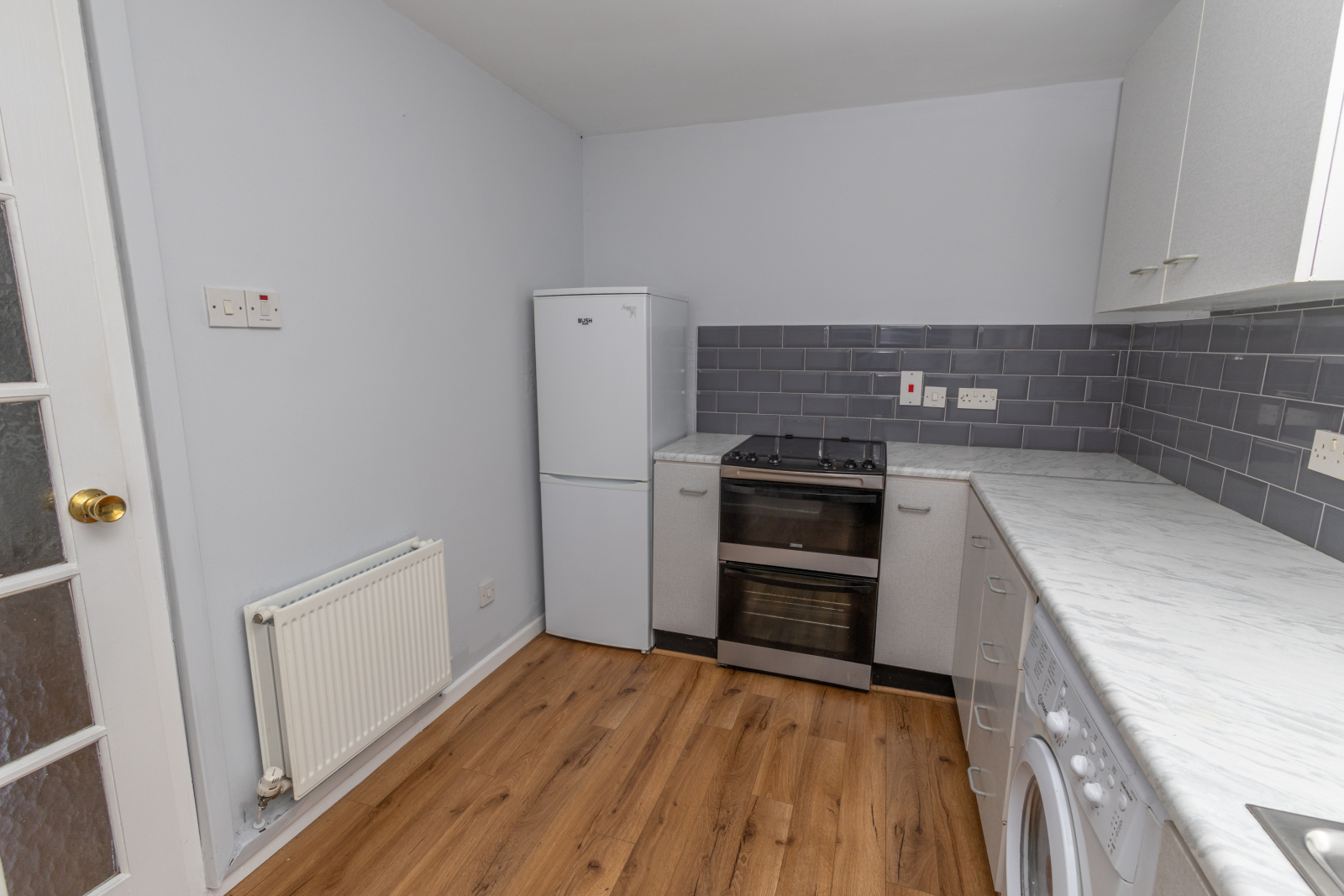 Range of high and low level units. Wooden flooring. Stailess steel sink unit with mixer taps. Cooker, Fridge Freezer & Washing Machine included in sale. Partly tiled walls. Radiator