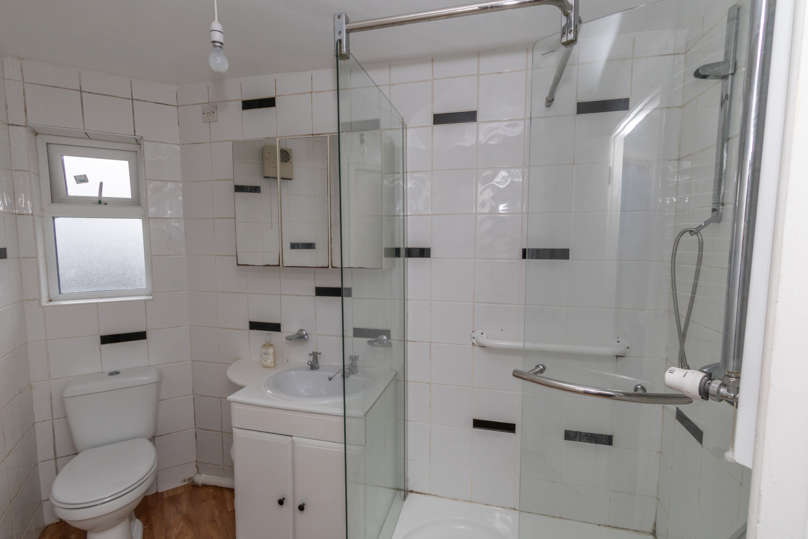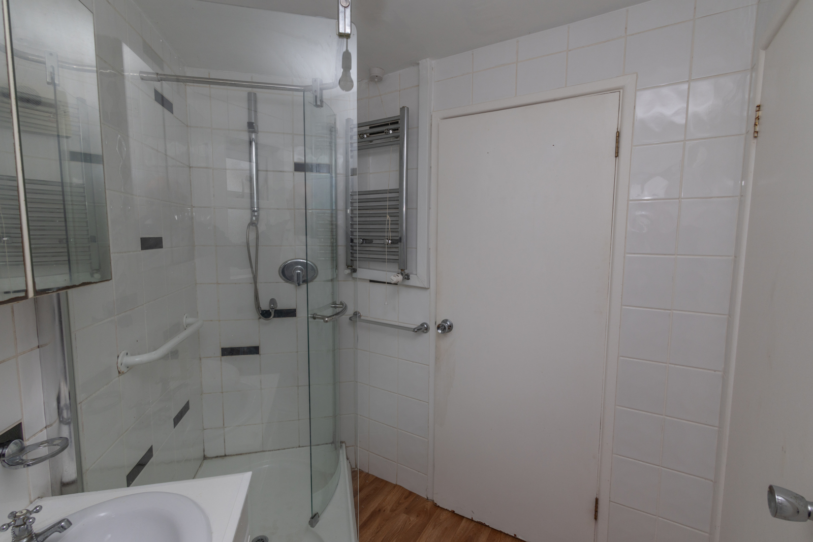 Walk-in Shower. Sink basin with cupboard underneath. W.C. Heated towel radiator. Wooden flooring. Fully tiled walls. Wall mounted mirror/unit.