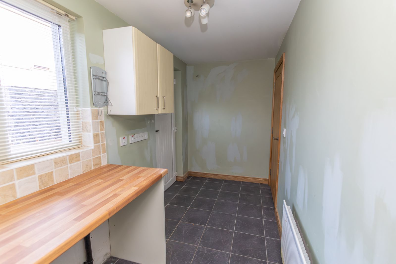 Tiled flooring. Partially tiled walls. Wall mounted cupboard. Workbench. Plumbed for laundry. External PVC door to rear.