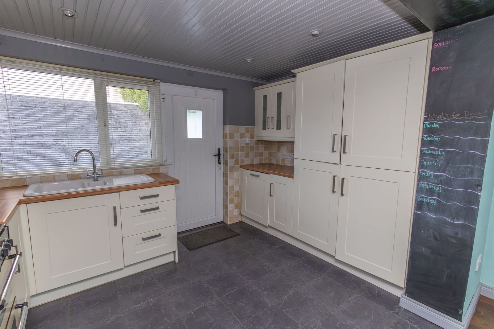 Tiled flooring. Partially tiled walls. Painted high and low units. Gas cooker and hob. Stainless steel extractor fan. Integrated dishwasher. Enamel sink