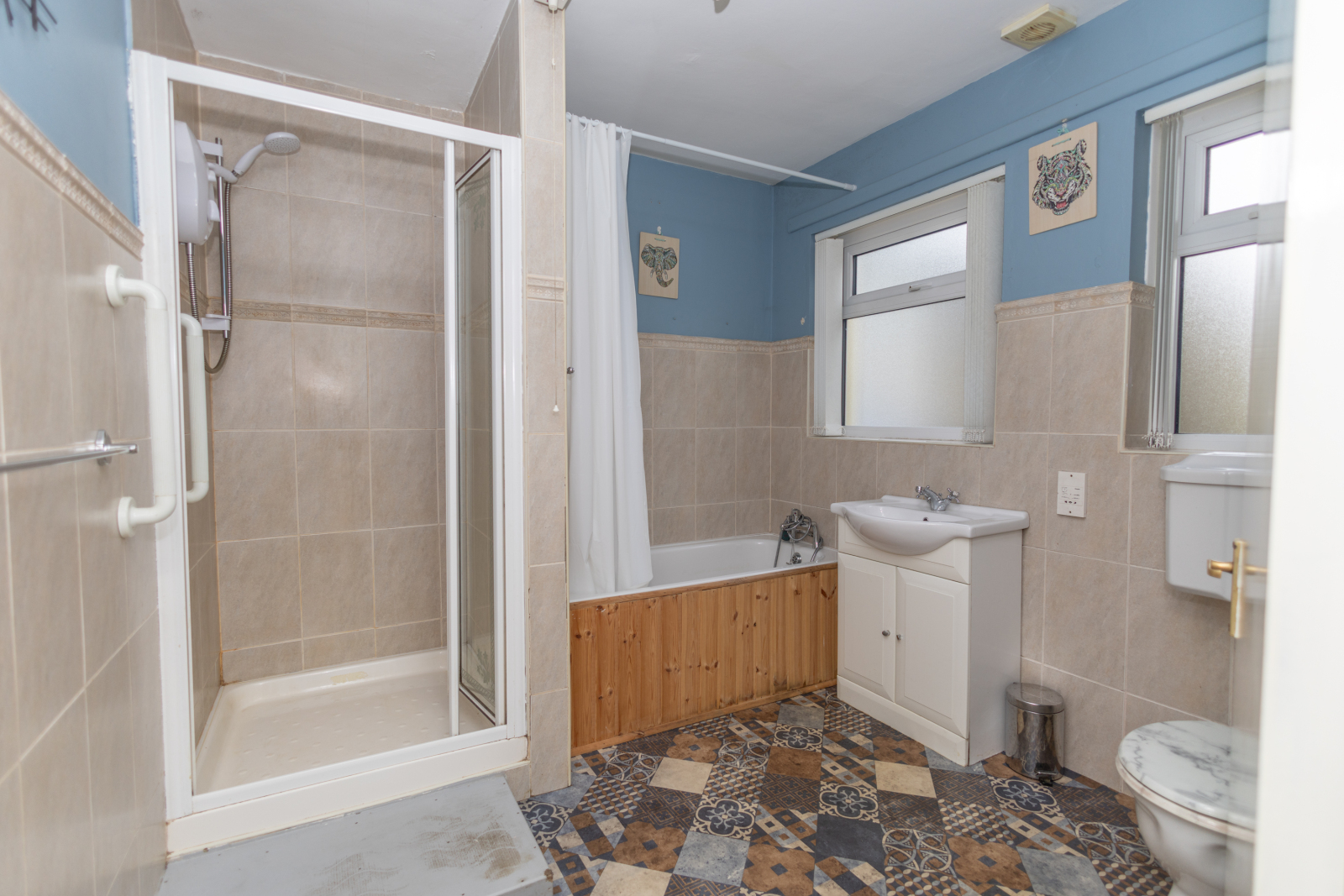 3 piece suite. Walk-in electric shower. Partly tiled walls. Linoleum fllooring. Extractor fan. Shaver plug
