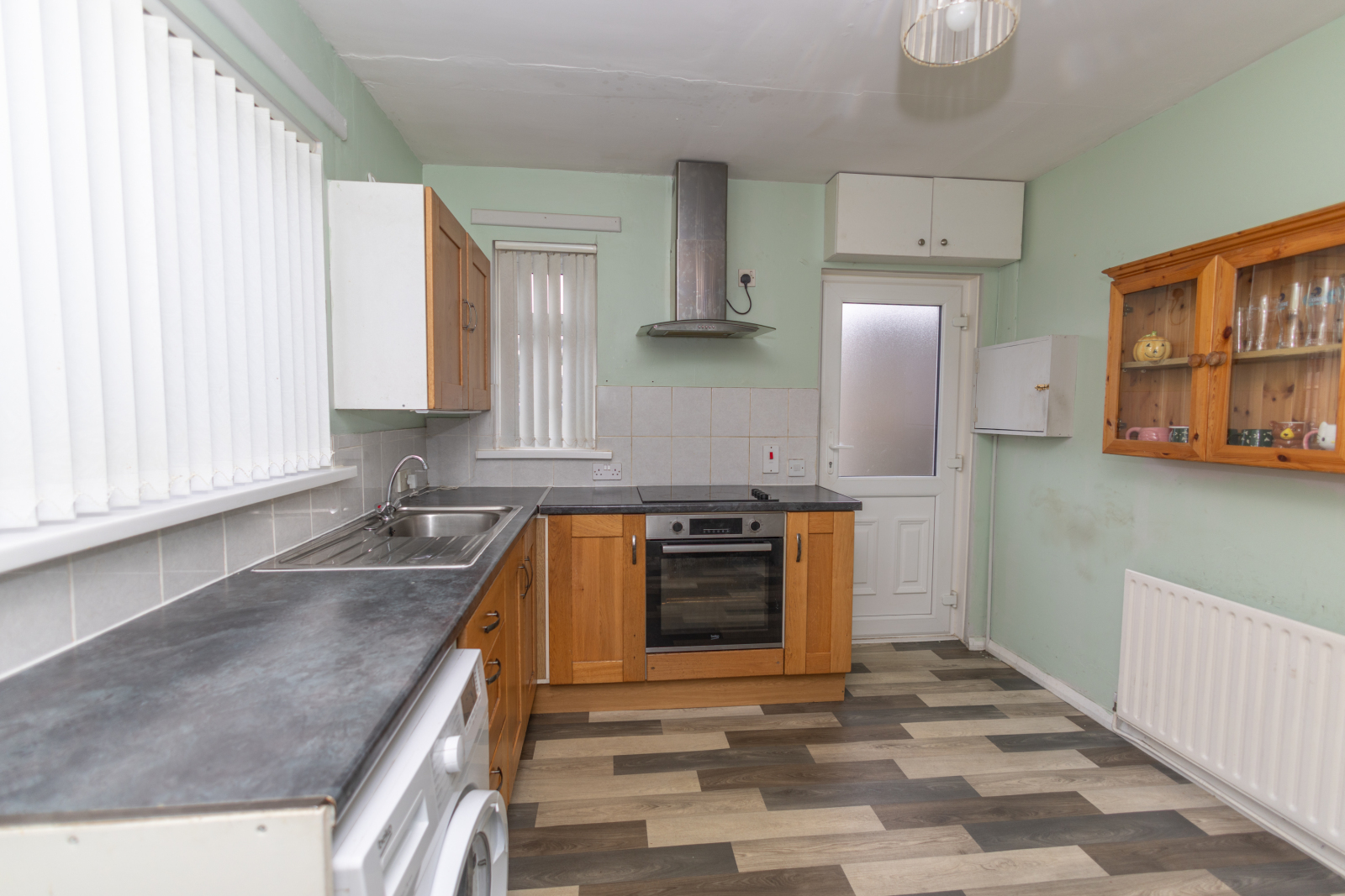 Range of high and low level units. Linoleum flooring. Stainless steel sink unit. Hob, oven and extractor fan. Plumbed for washing machine. Wall cabinet