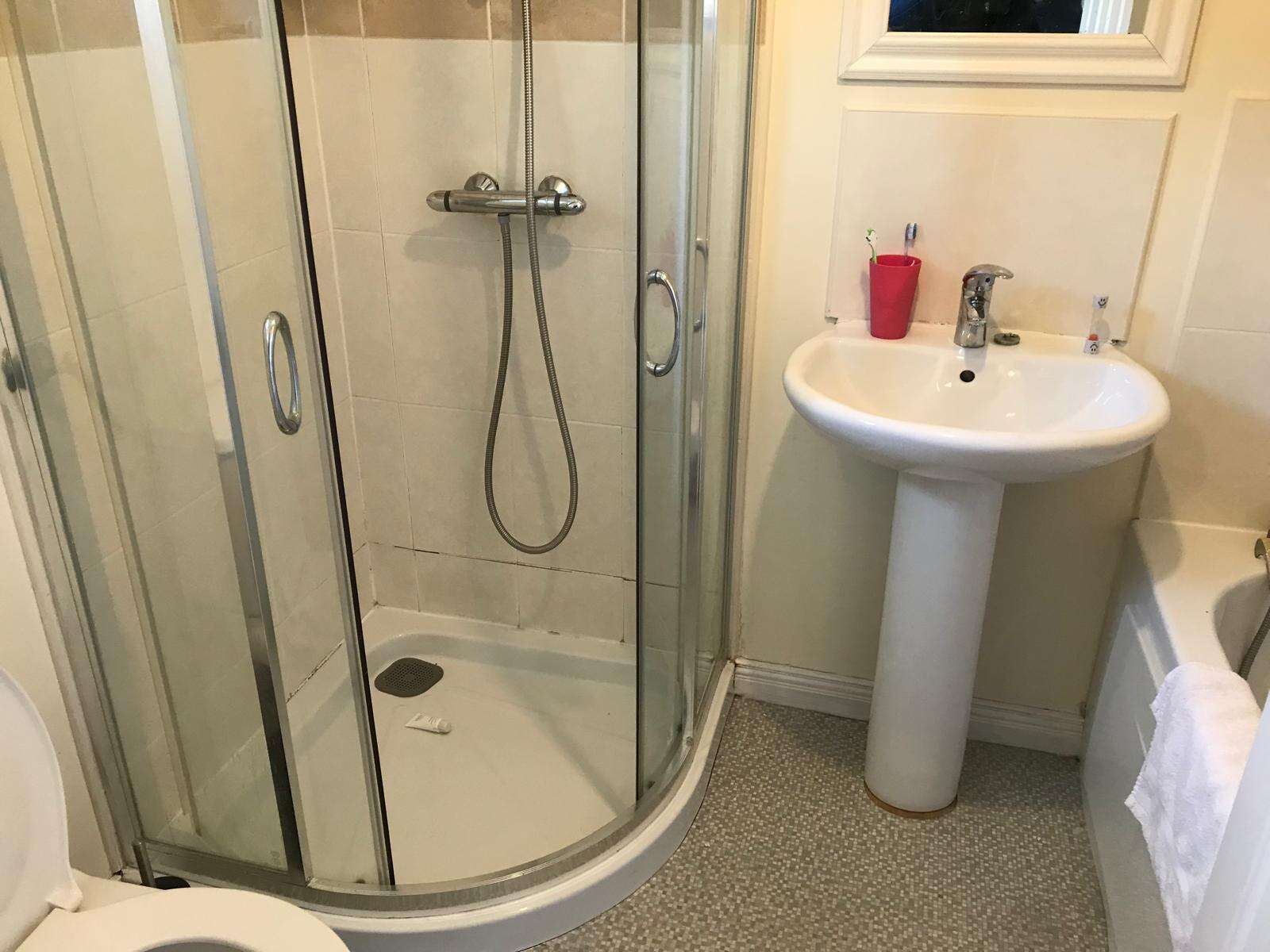BATHROOM: 2.3m x 1.7m with bath, toilet, shower and wash hand basin, part-tiled splash-back, extractor fan.