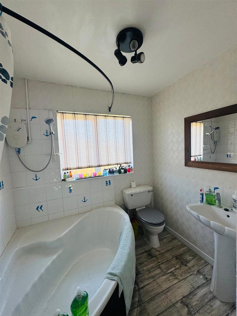 Comprising corner bath with electric shower over and tiling around, whb with tiling around, wc.