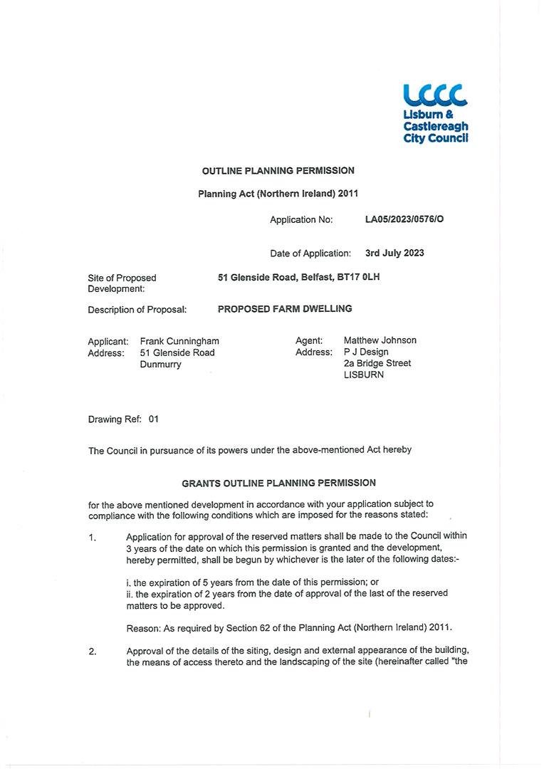 An opportunity to acquire an area of land that benefits from outline planning permission situated of the Glenside Road at the junction of the Upper Springfield road, Hannahstown. The subject land is situated in a convenient rural location just over five miles from Belfast and Lisburn and less that fifteen minutes from Belfast International Airport. Maps, details and red line boundary are for general identification purpose only. A building plot which is set in a pleasant semi rural area on the outskirts for Belfast enjoying views over the surrounding Countryside. Viewing; call on site.
