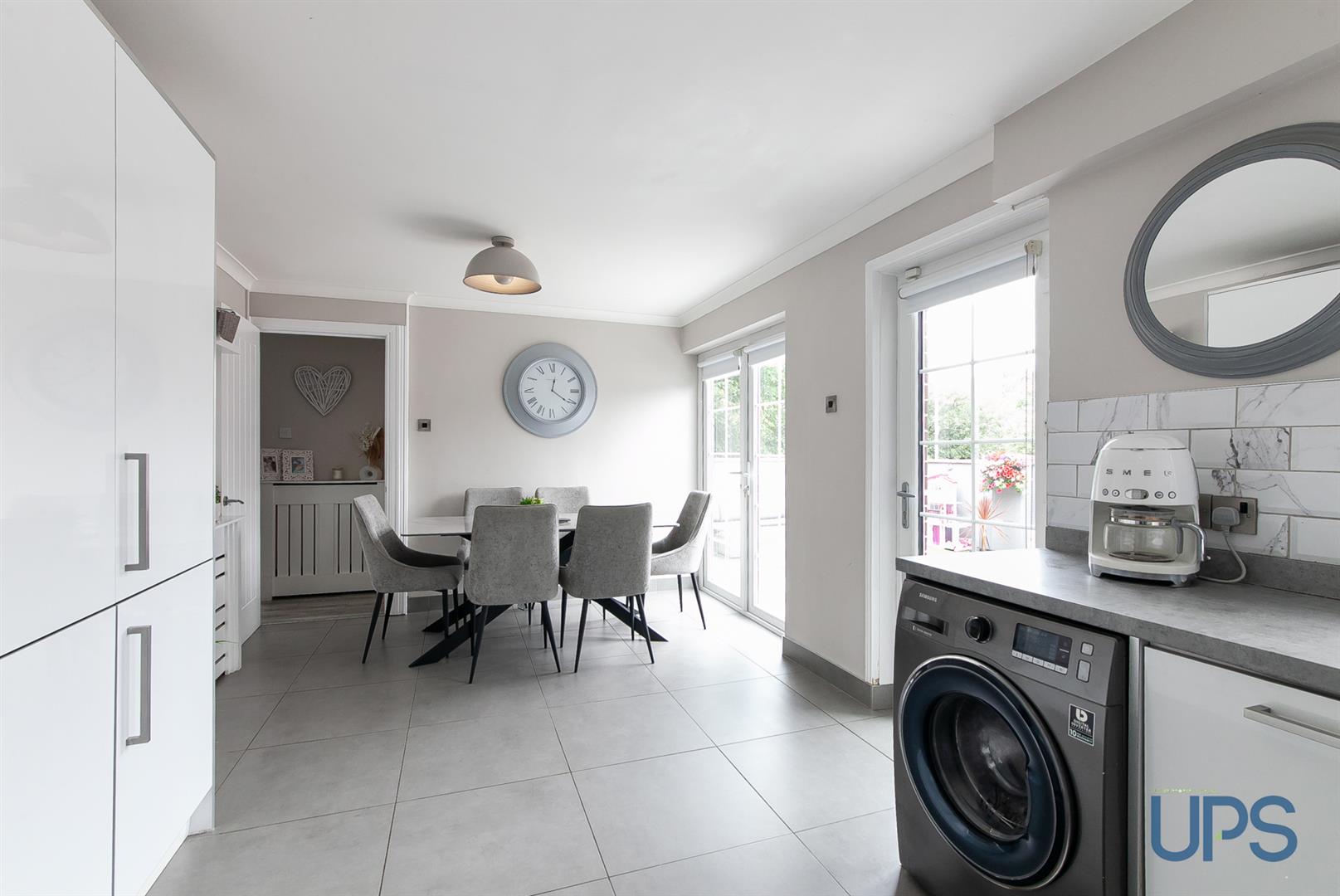 Range of high and low level units, feature work tops, 4 ring hob, built in oven and microwave, plumbed for washing machine and dishwasher , modern sink unit, feature tiling and flooring, casual dining area with double patio doors.