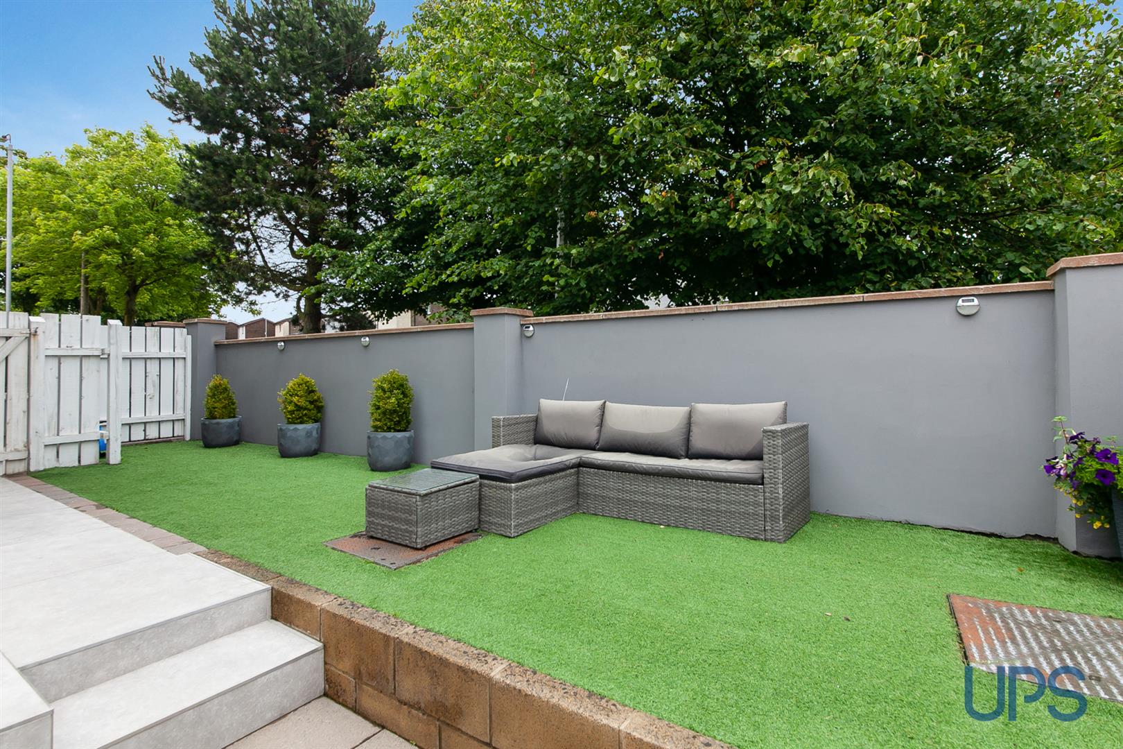 Fantastic landscaped corner site, secure and private, feature double gates, flagging with detailing and further stepped paving housed gas boiler.