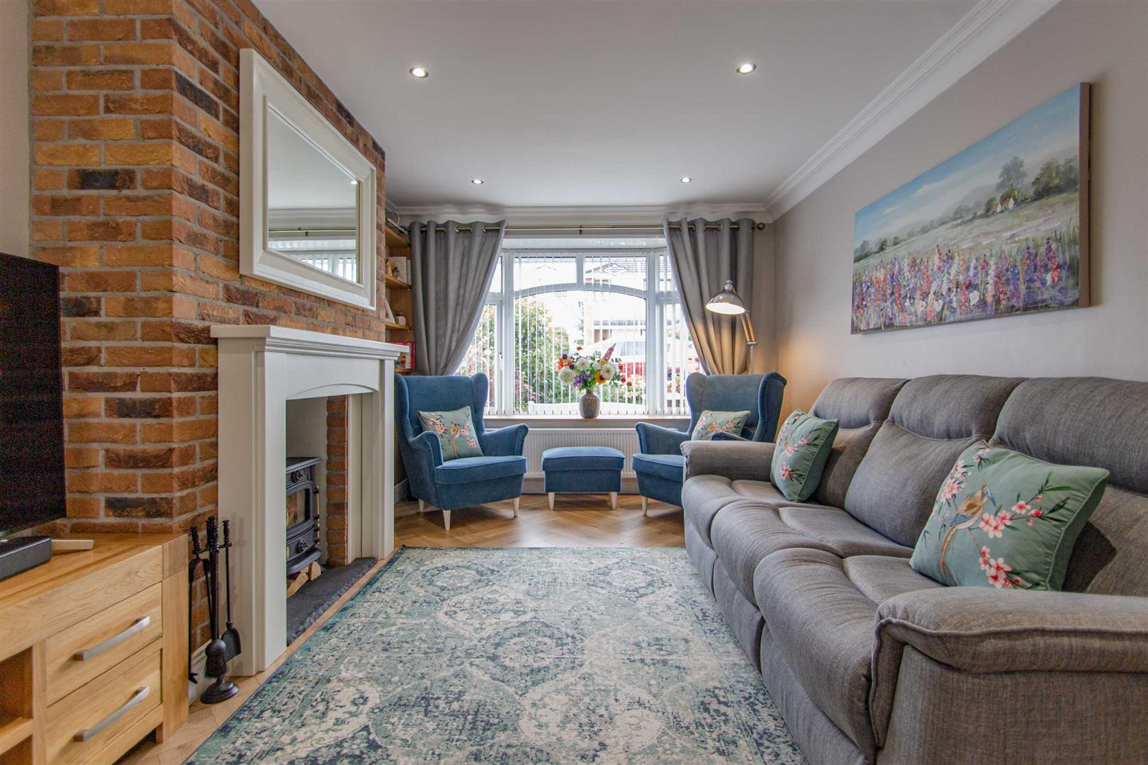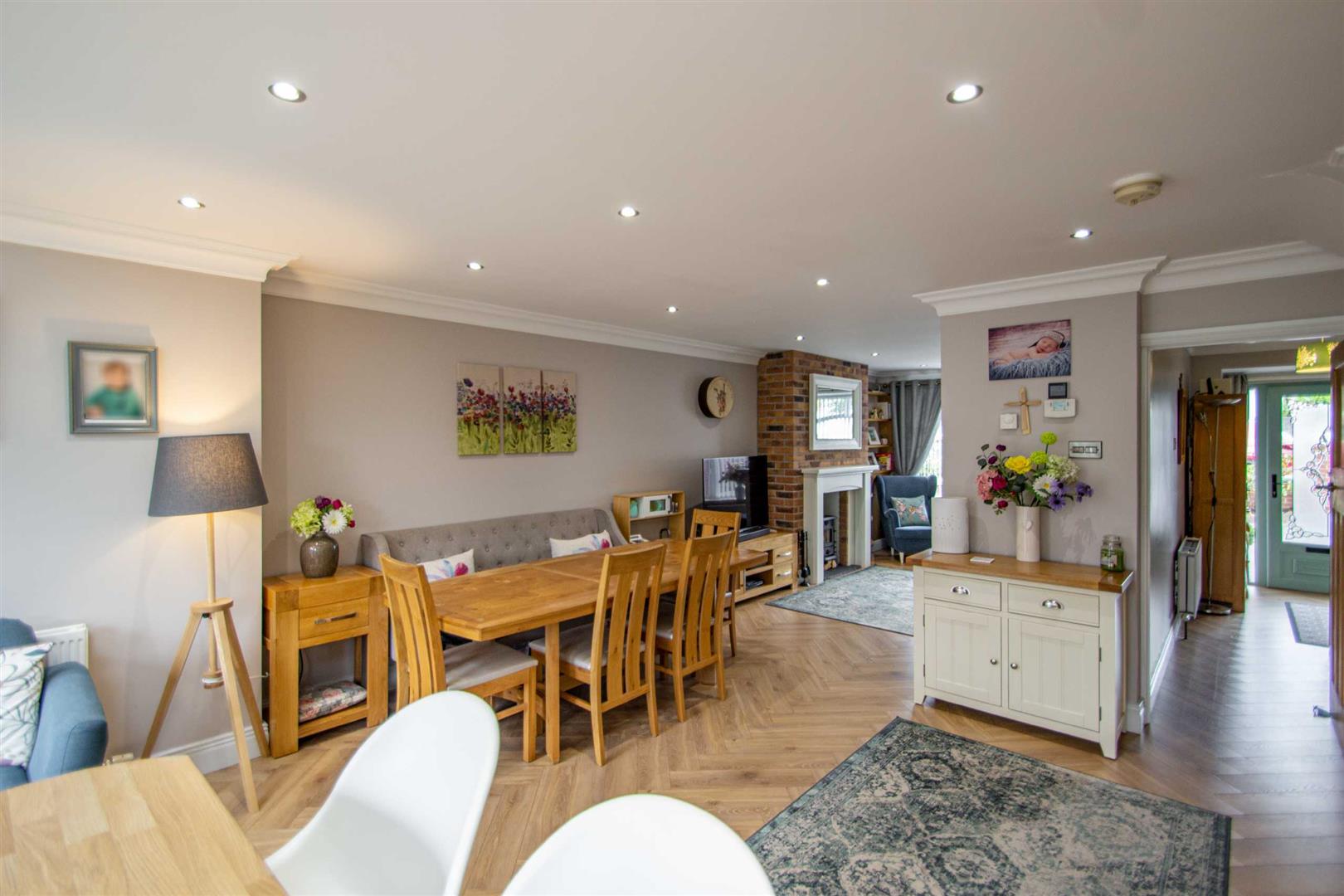 Bay window, spotlights, cornicing, recently installed wood strip herringbone effect floor, wood burning stove, open plan to;