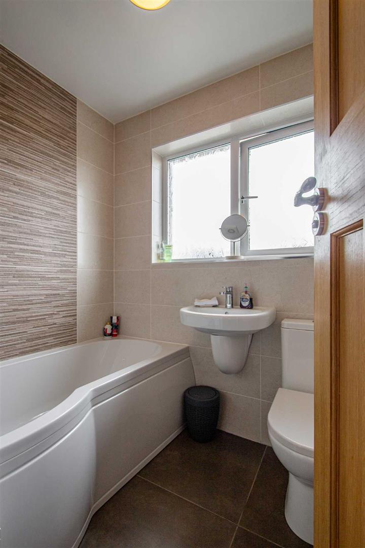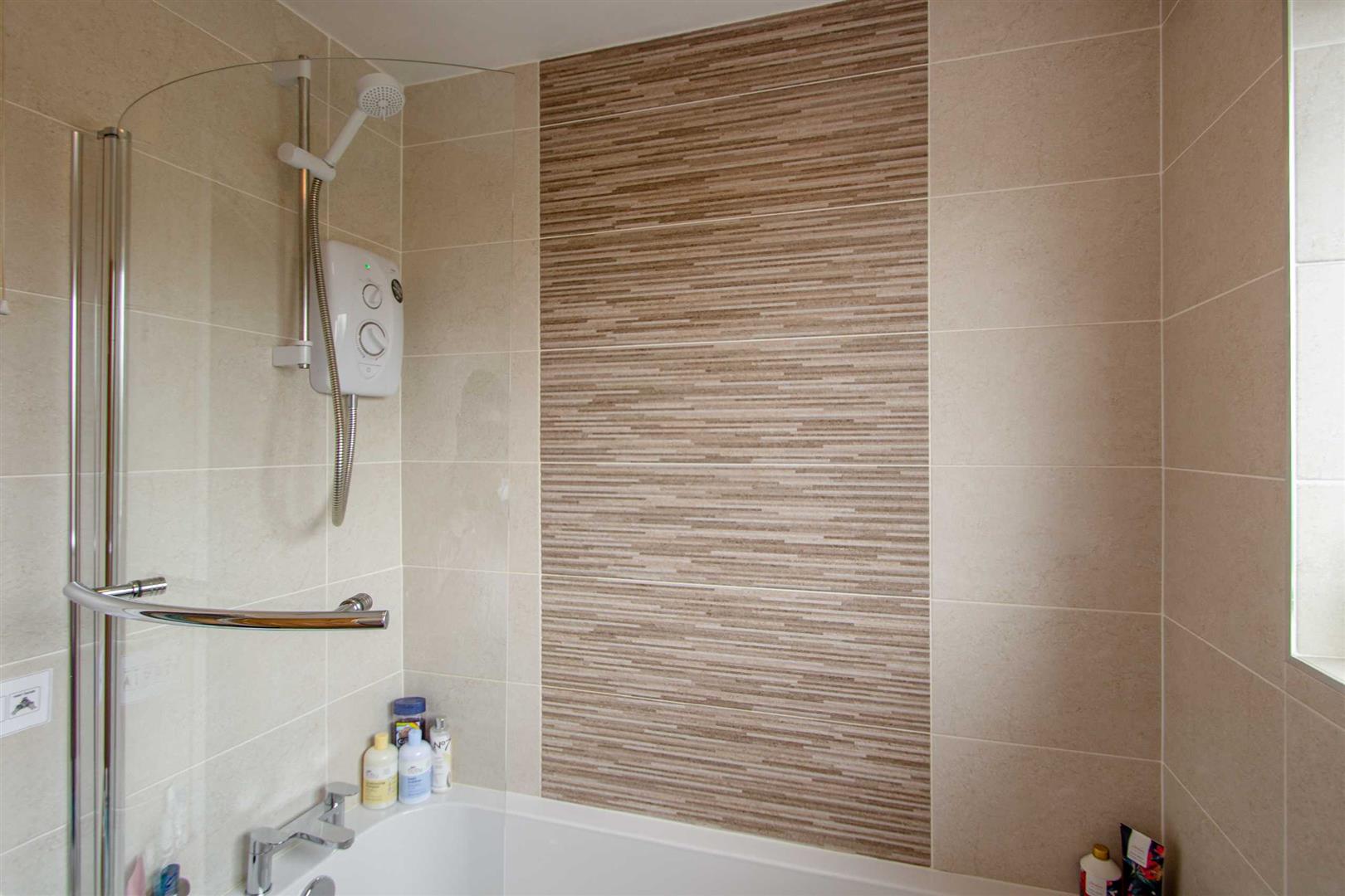 Bath with mixertaps, electric shower unit, ½ pedestal wash hand basin, low flush w.c, chrome effect sanitary ware, extractor fan, chrome towel warmer, beautiful tiled walls and floor.