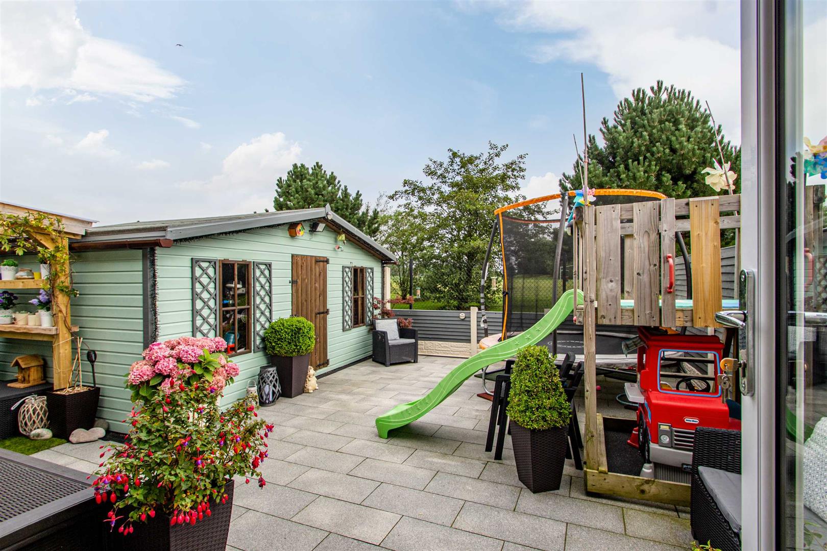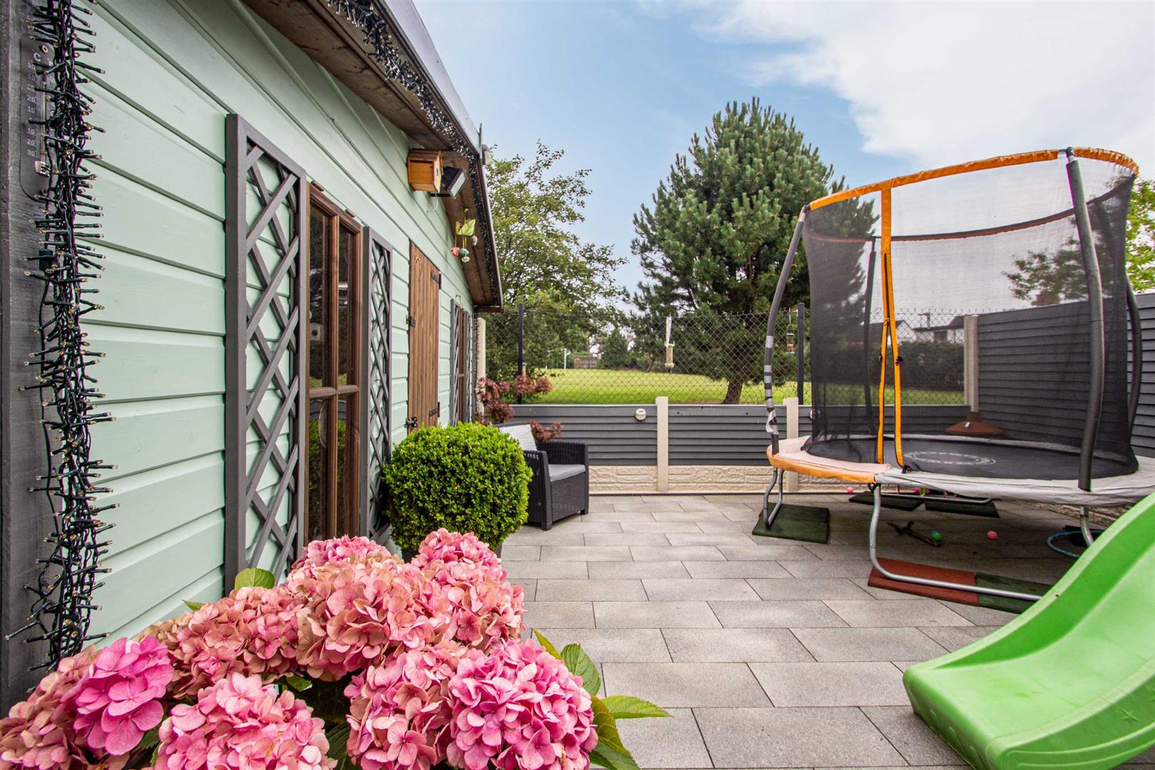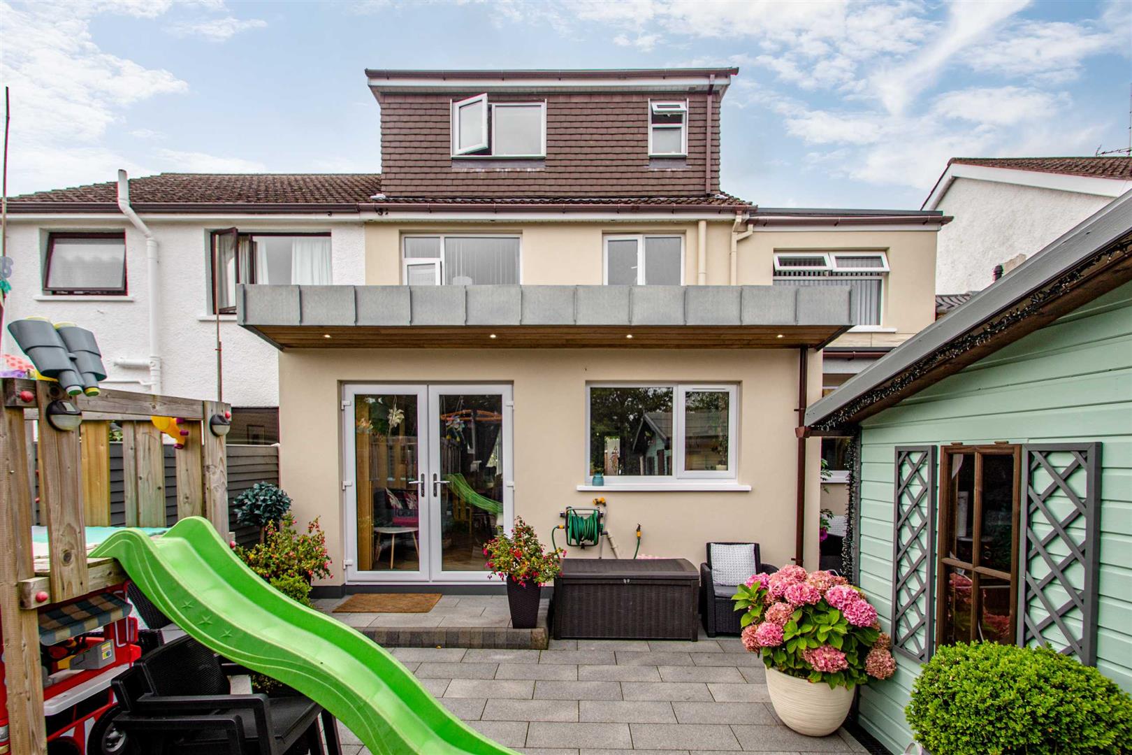 Well maintained, privately enclosed rear garden, flagged in granite, cedar canopy with feature spotlights, outside tap to front and rear, additional feature covered area, newly built wall to front with galvanised gates.