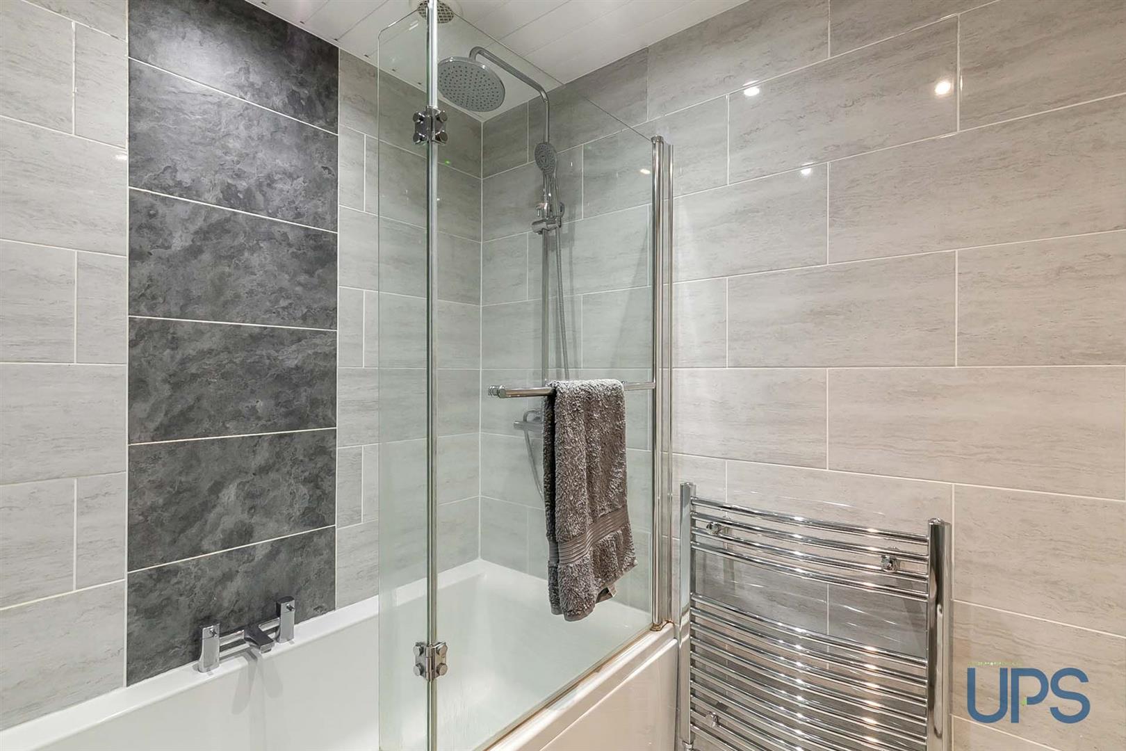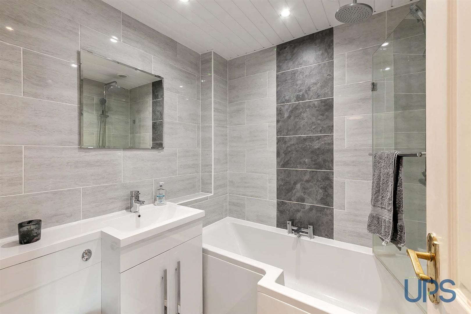 Bath, thermostatically controlled shower unit, low flush w.c, wash hand basin and storage units, spotlights, chrome effect sanitary ware, chrome effect towel warmer, beautiful tiled walls and floor, extractor fan.