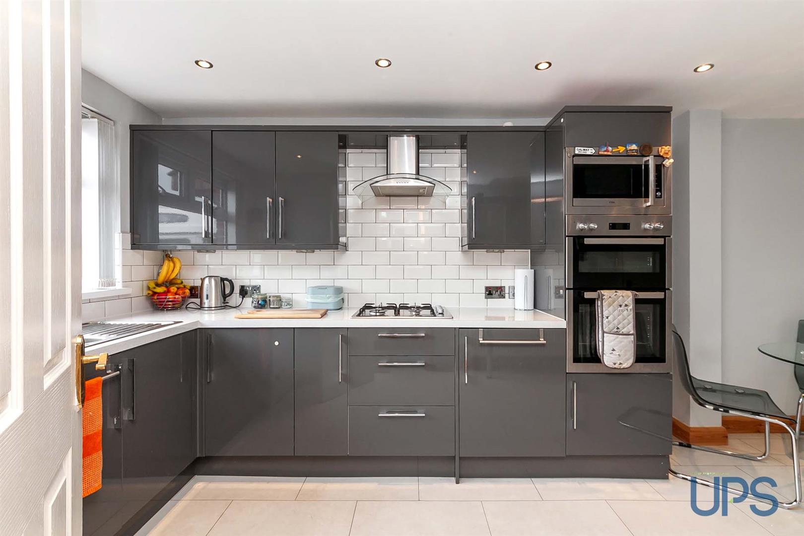 Range of high and low level units, single drainer stainless steel 11/2 bowl sink unit, built-in oven, built-in microwave, plumbed for dishwasher, beautifully tiled walls, integrated fridge, spotlights.