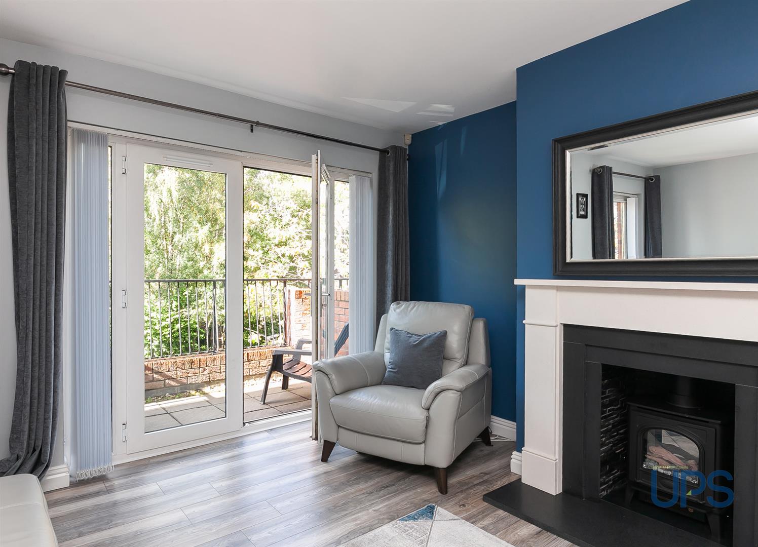 Wooden effect strip floor, Upvc double doors.
