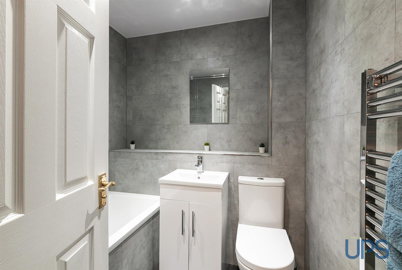 Panelled bath, telephone hand shower, wash hand basin with vanity unit, low flush w.c.