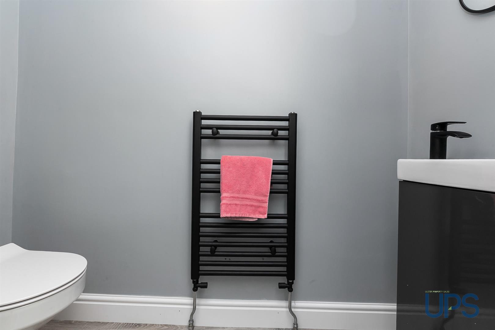 Feature shower enclosure, black effect shower head, wash hand basin with vanity unit, vertical towel warmer, low flush w.c, ? wood covering and luxury downlighters.