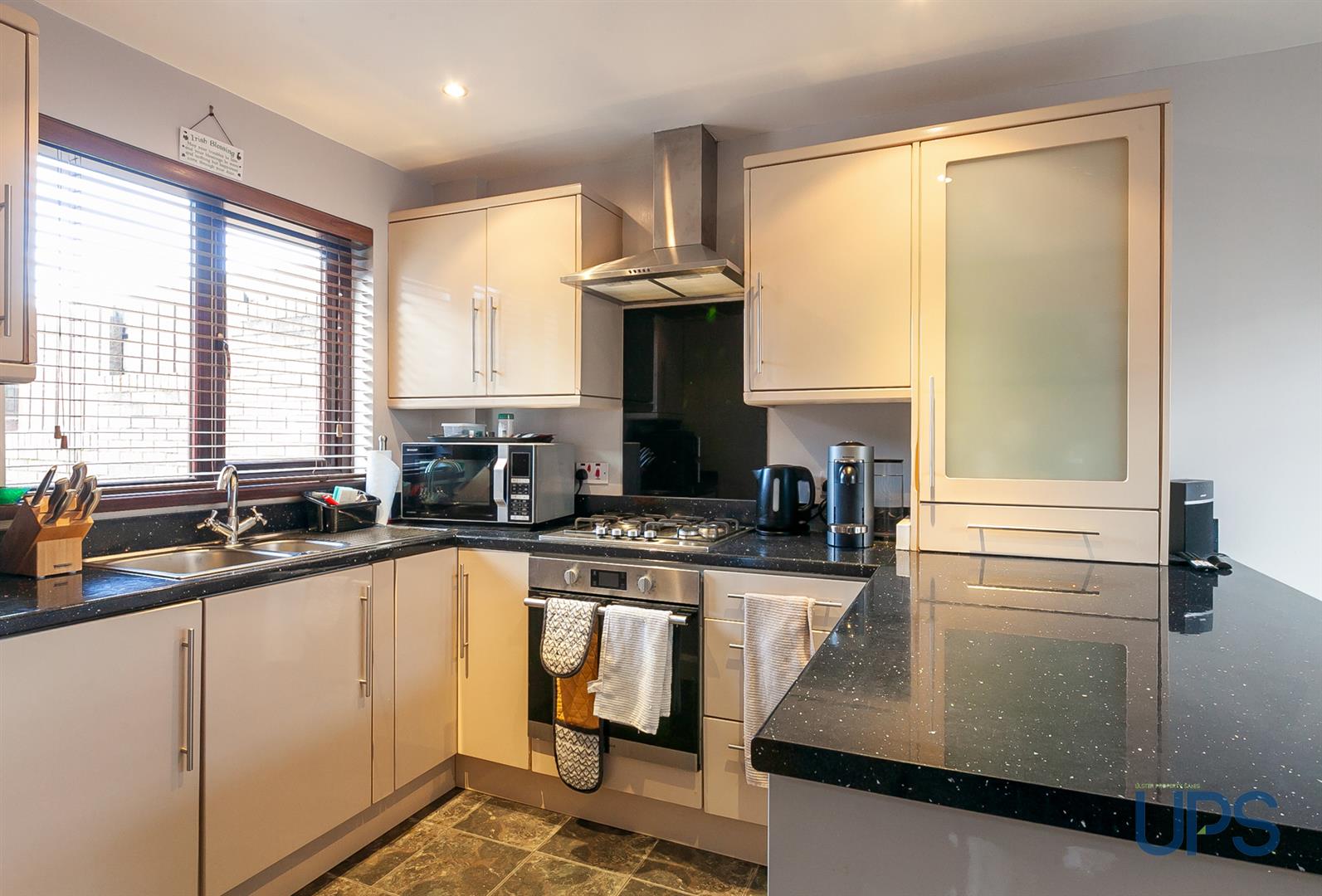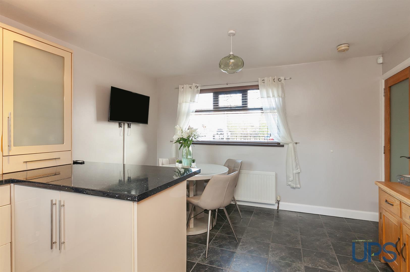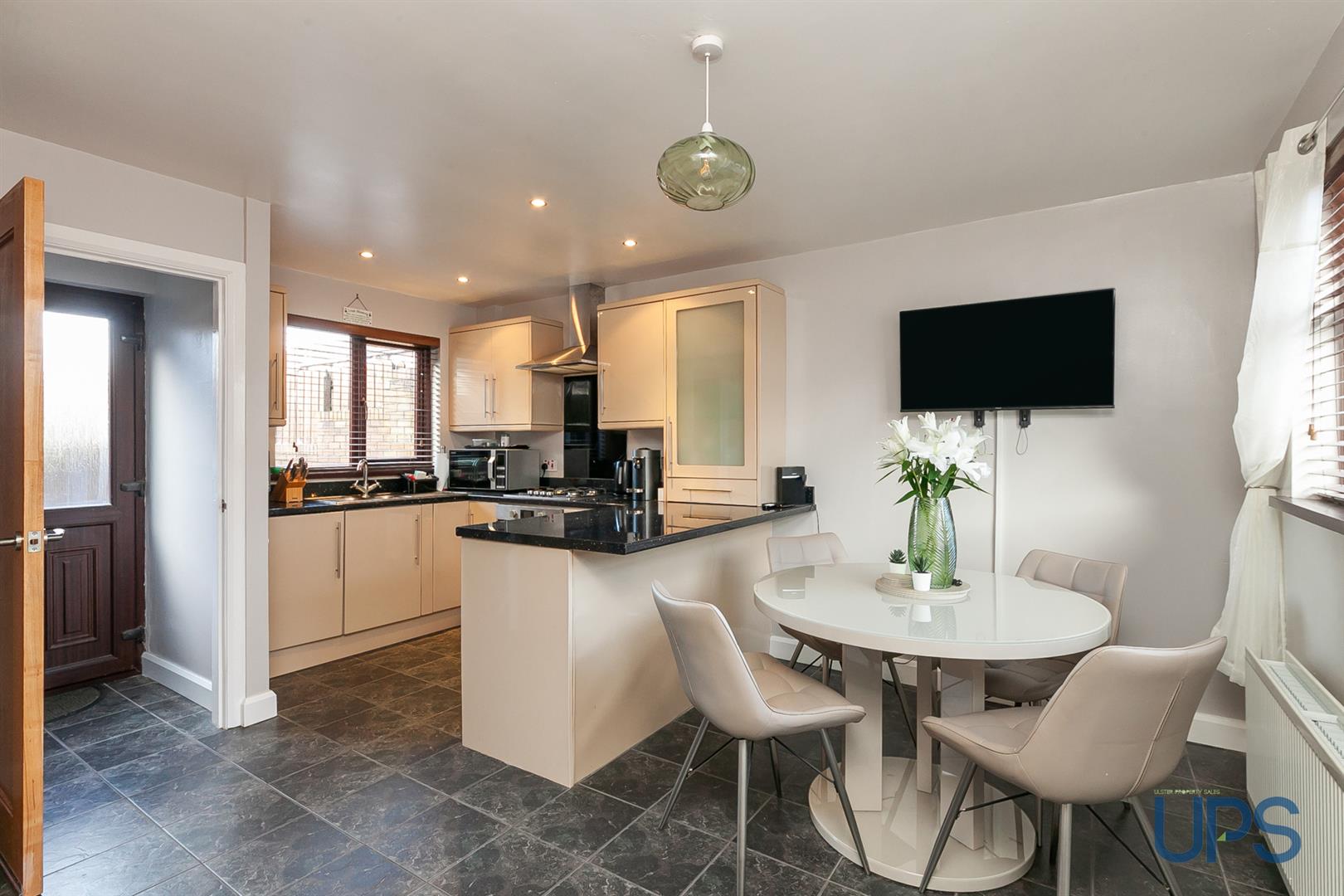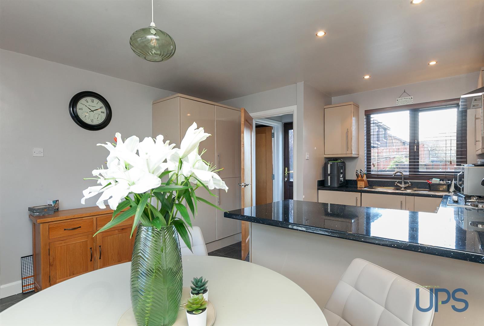 Range of high and low level units, formica work surfaces, breakfast bar, 4 ring gas hob, underoven, overhead extractor hood, single drainer stainless steel sink unit. Plumbed for washing machine, breakfast bar, downlighters. Open to a casual dining area.