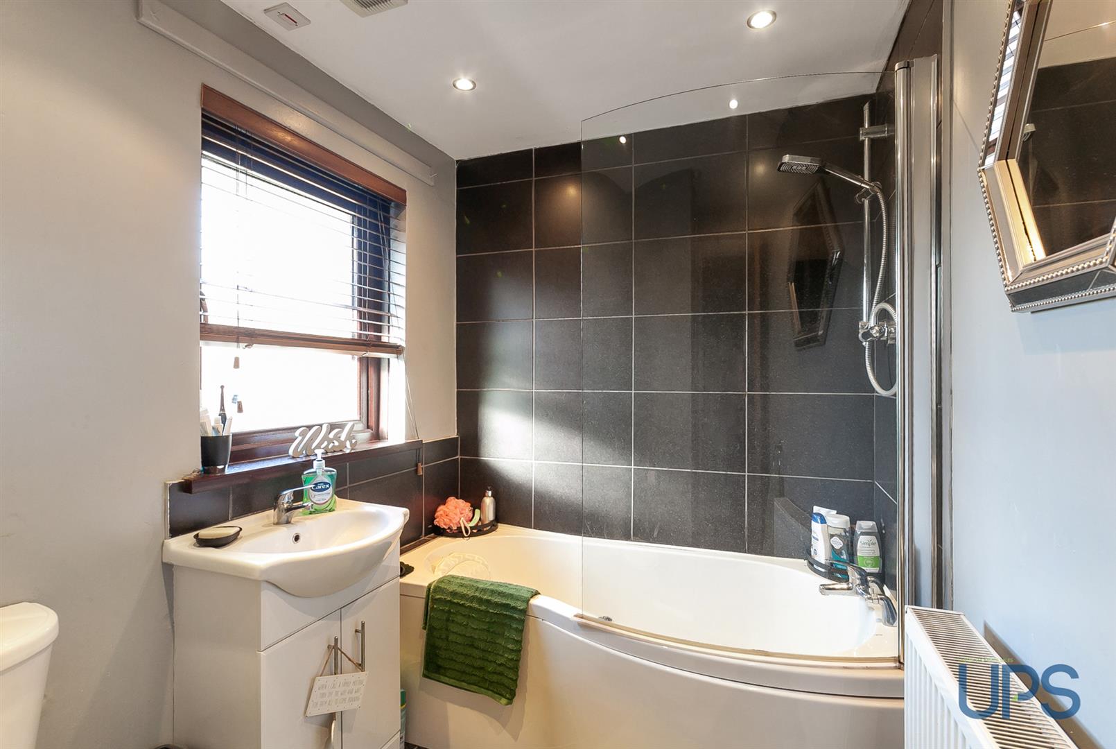 Panelled bath, thermostatically controlled shower unit, shower screen, low flush w.c, wash hand basin, vanity unit, tiling, ceramic tiled floor.