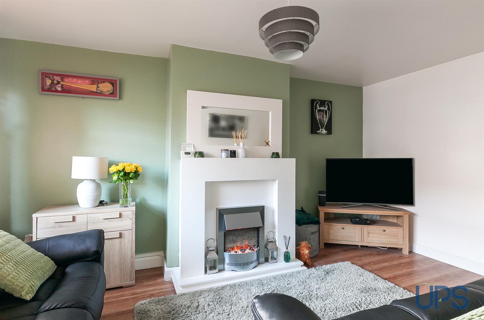 Feature effect fire-place with inset and hearth. Wooden effect strip floor.