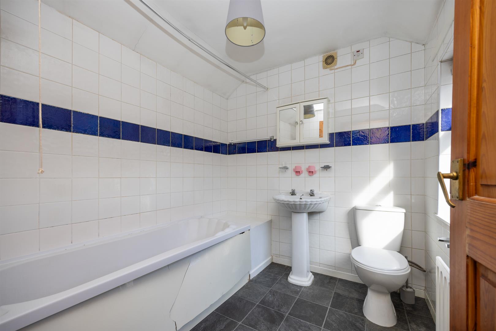 Bath, electric shower unit, low flush w.c, pedestal wash hand basin, extractor fan.