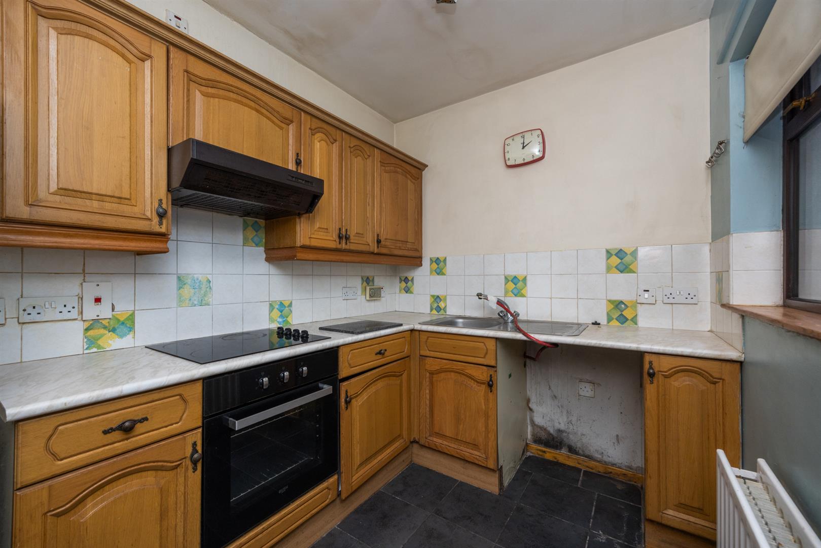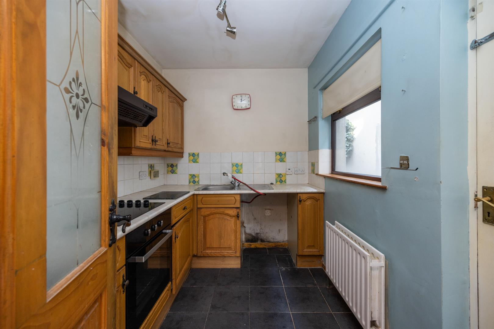 Range of high and low level units, single drainer stainless steel sink unit, built-in hob and oven, tiled floor, hardwood glass panelled back door.