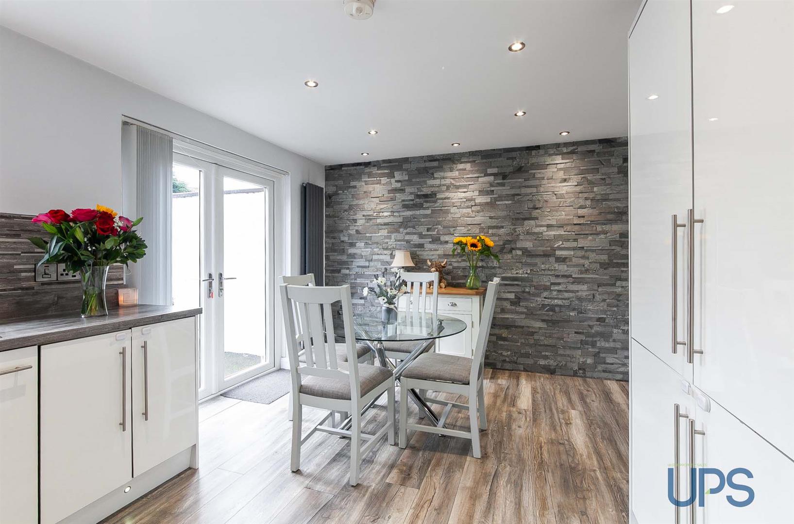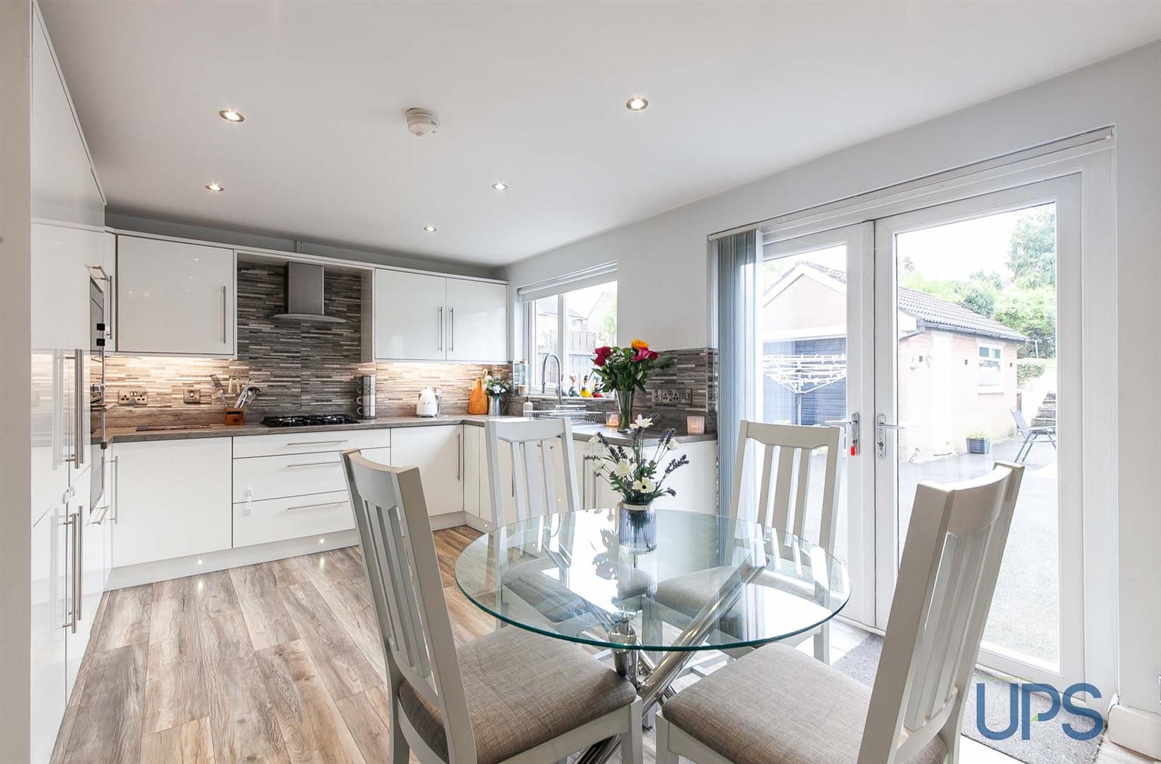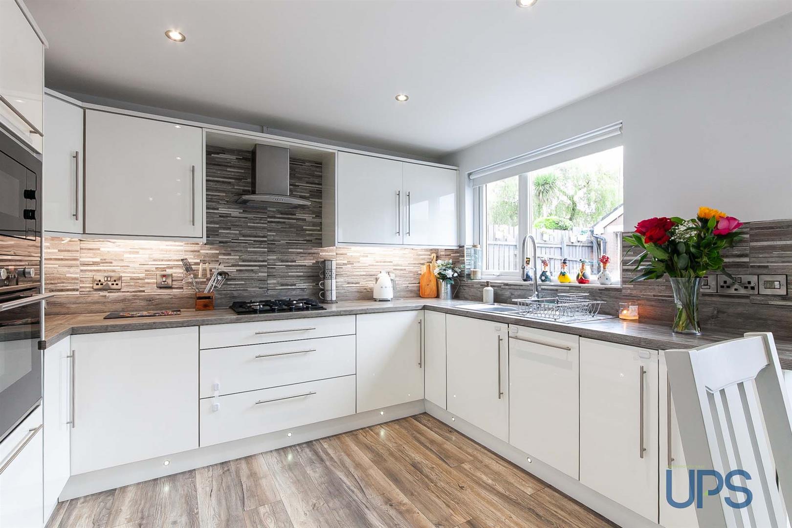 Range of high and low level units, single drainer stainless steel 1 1/2 bowl sink unit, built-in hob, built-in micorwave, built-in oven, integrated fridge and freezer, stainless steel extractor fan, kick board lighting, underunit lighting, partially tiled walls, wooden effect strip floor, spotlights, open plan to dining space, vertical radiator, Upvc double glazed doors to extensive gardens.