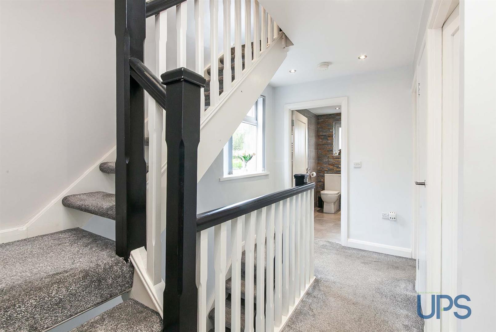 Spotlights, storage cupboard. Stairs to;