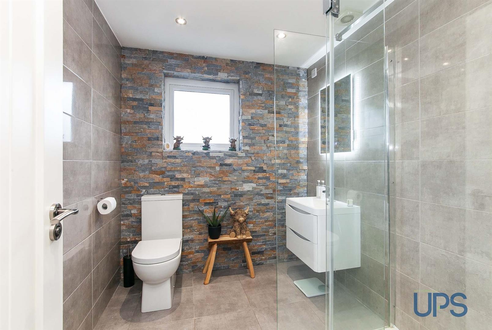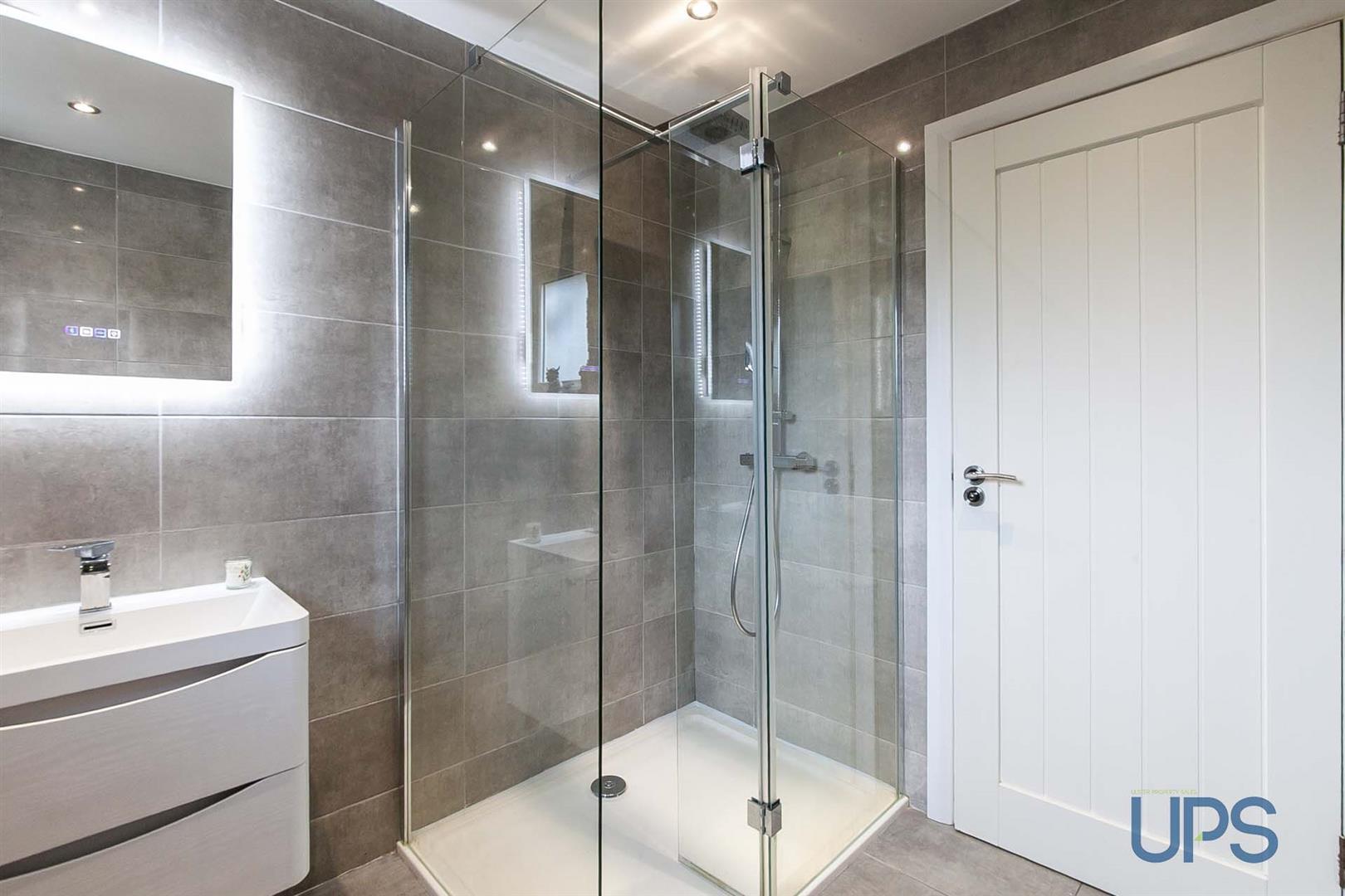 Large shower cubicle, wall hung wash hand basin with storage, low flush w.c, towel warmer, contemporary tiled walls and floor, spotlights, extractor fan.