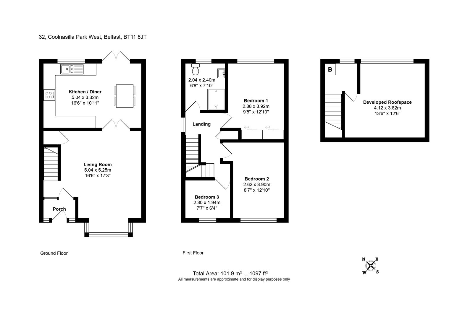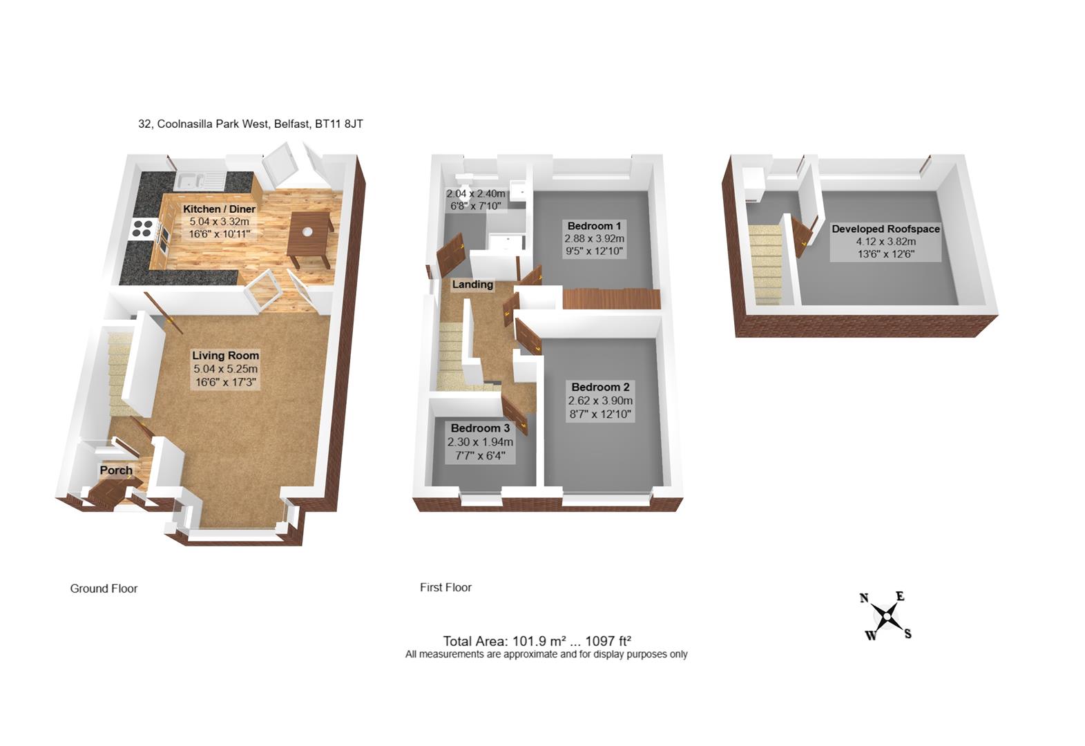 The property features approximately 1,097 sq. ft. of bright and spacious living space with an above average energy rating (EPC C-75). On the first floor, there are three bedrooms and a modern shower room, along with access to a developed roof space with spotlights.